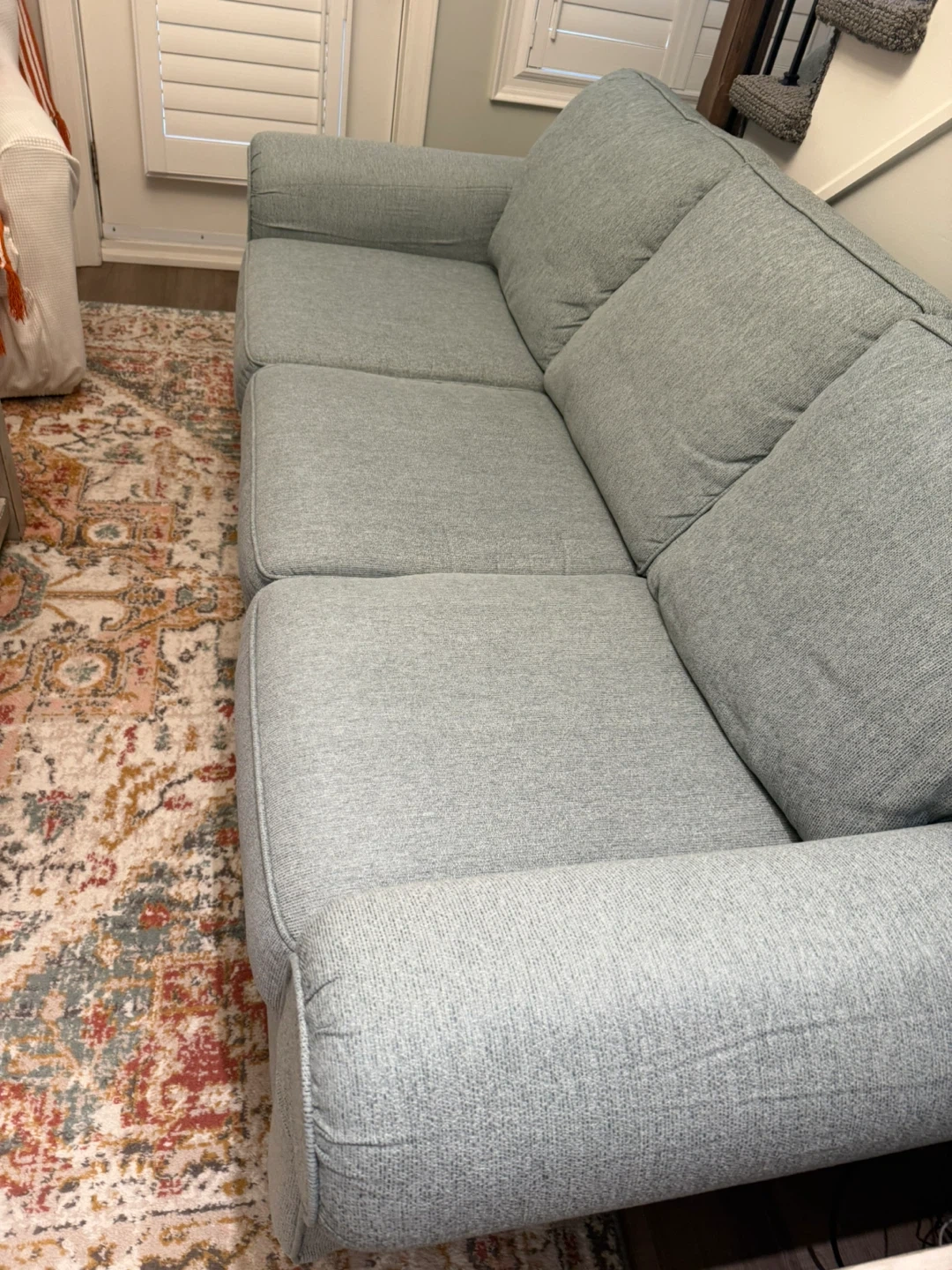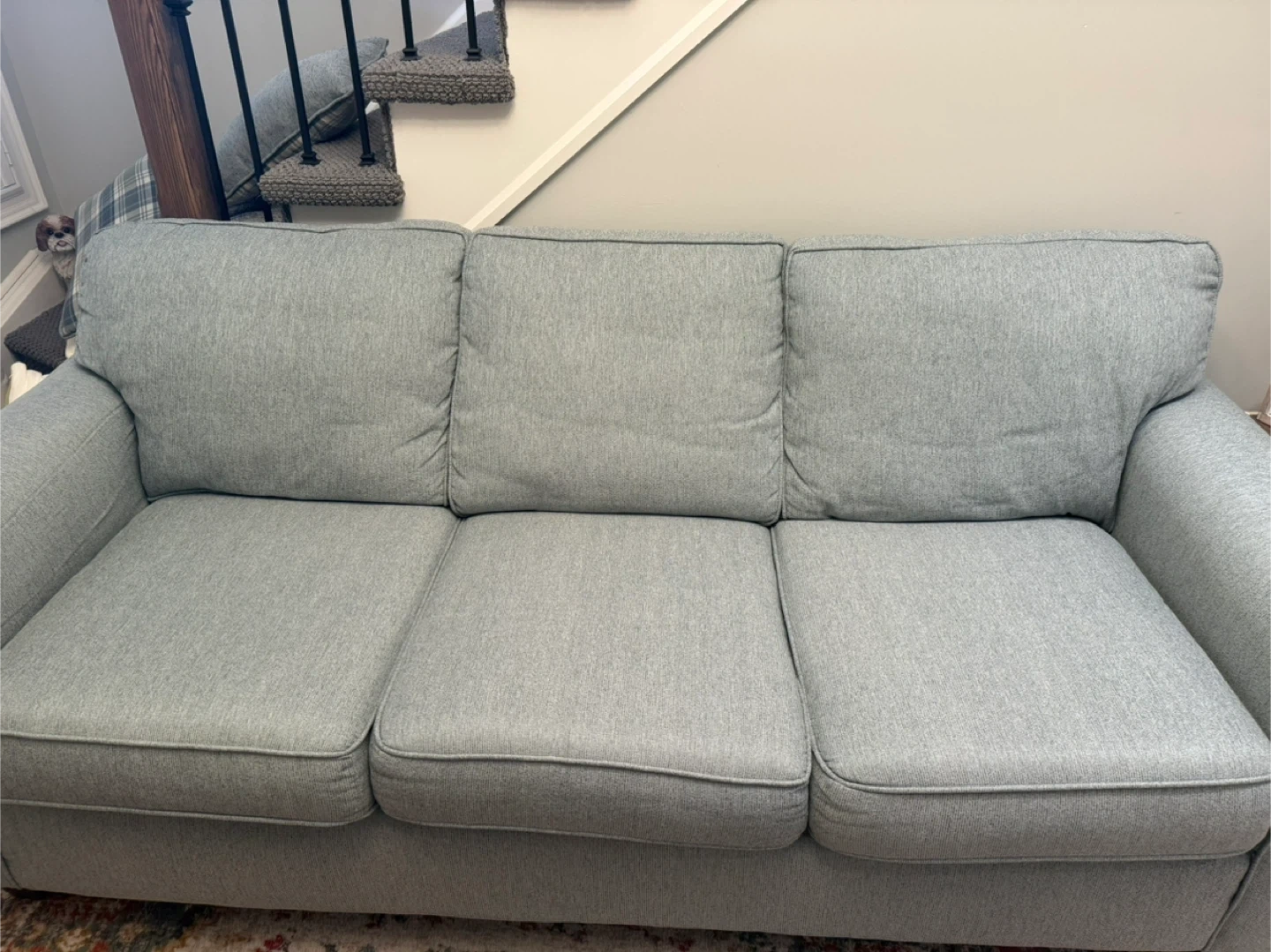 Selling a comfy three-seat sofa in a light green colour. It's in great condition and would be a lovely addition to any living room or den. The cushions are soft and supportive, perfect for lounging!
