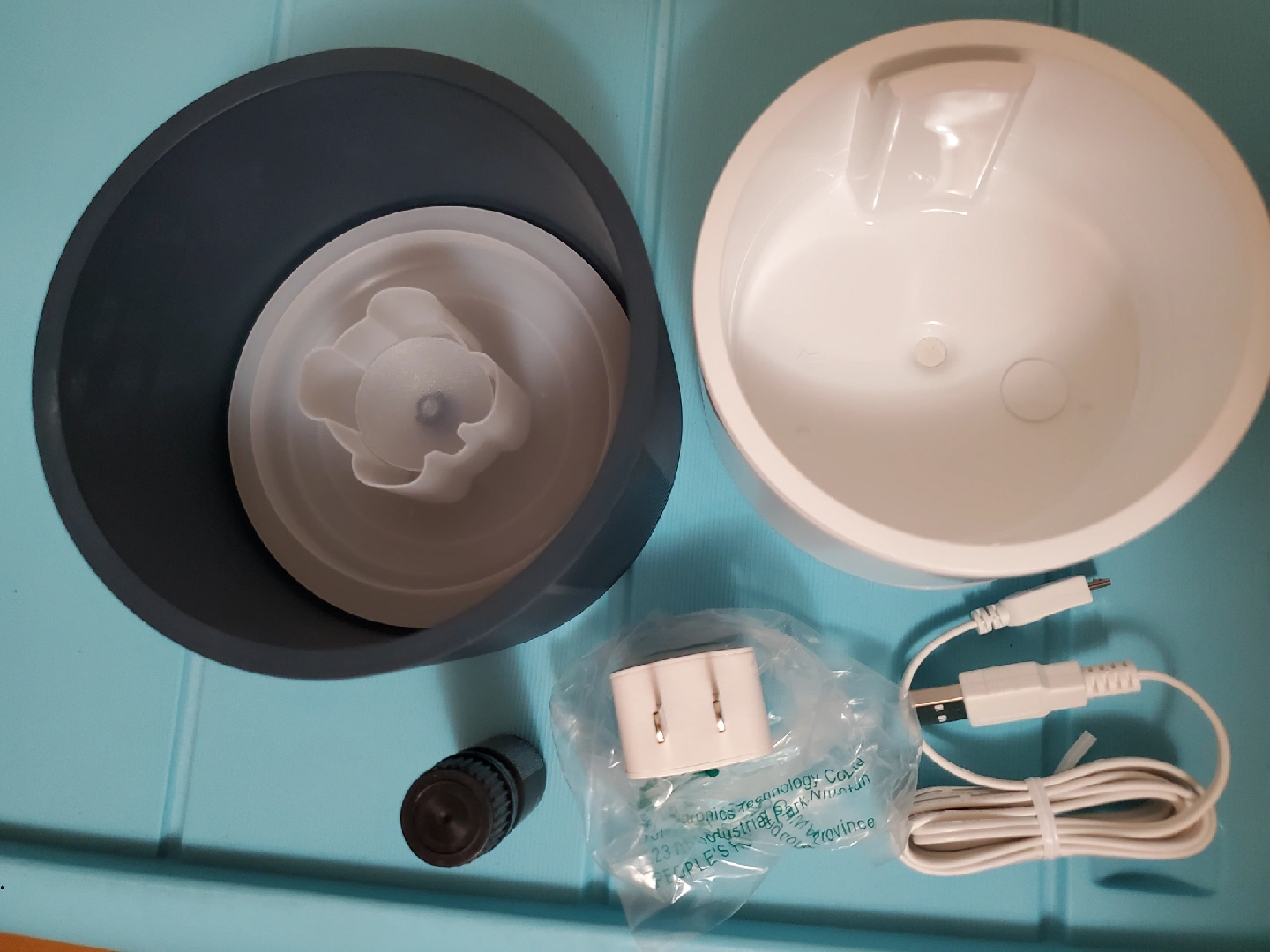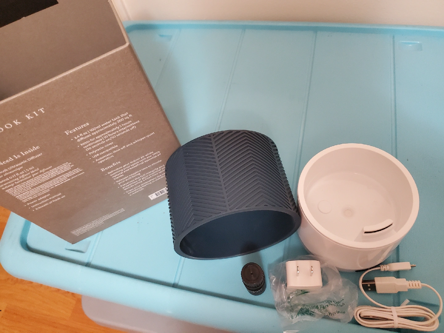 I'm selling a brand new Saje Natural Wellness Aroma Nook Kit Nighttime Edition diffuser and blend. It's an ultrasonic diffuser with a 100ml water tank, suitable for approximately 200 sq ft. It features intermittent (30 seconds on/off) or continuous run time, automatic shut-off, and whisper-quiet operation. Included in the box are the diffuser, a power adaptor, and a 5ml bottle of Unwind harmonizing diffuser blend
