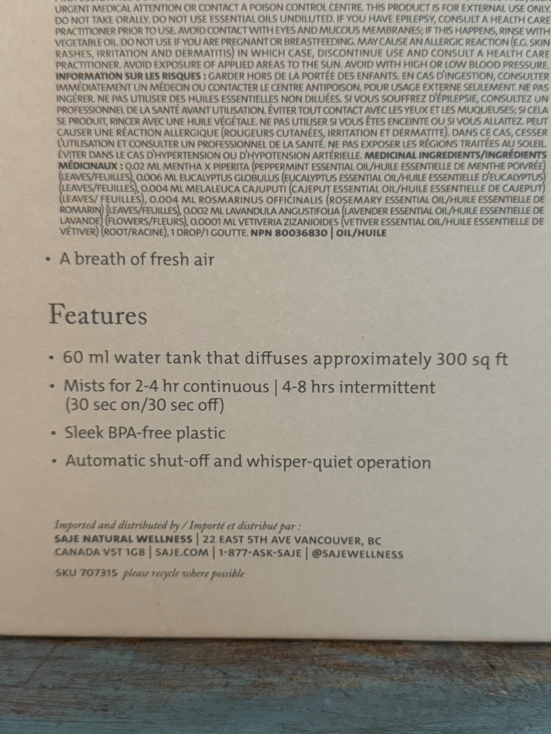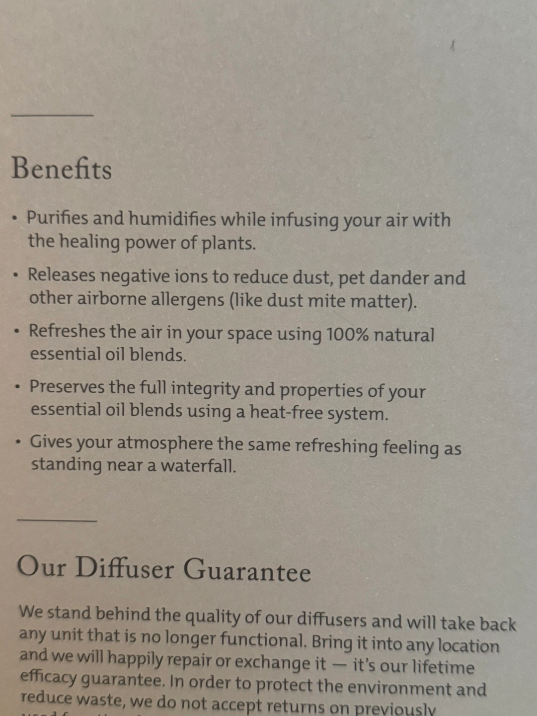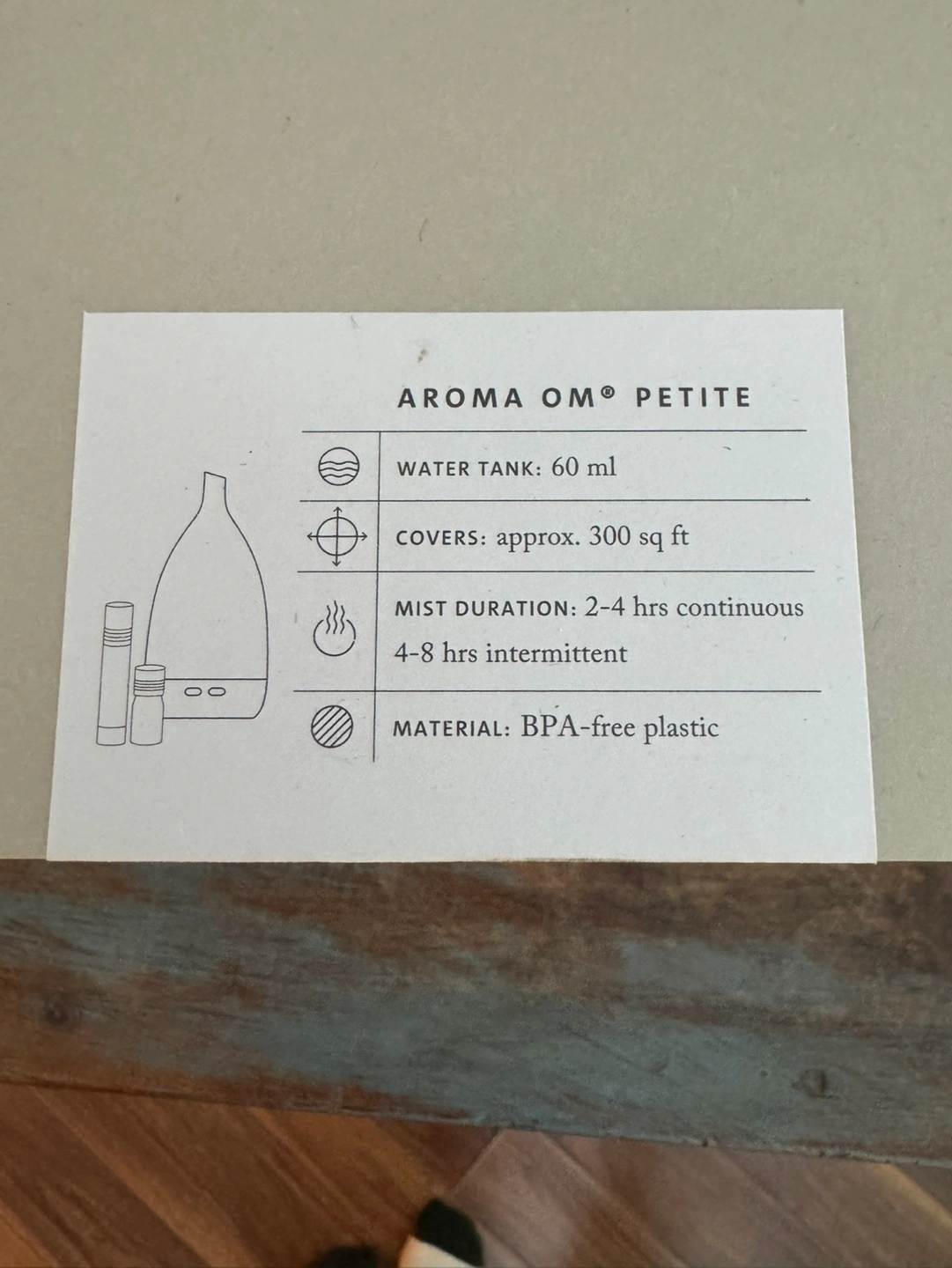 Hardly used. Works perfectly. I just use my other one more. Ultrasonic aroma diffuser. Covers approximately 300 sq ft. Mist duration 2-4 hrs continuous, 4-8 hrs intermittent. BPA-free plastic. Limited edition.