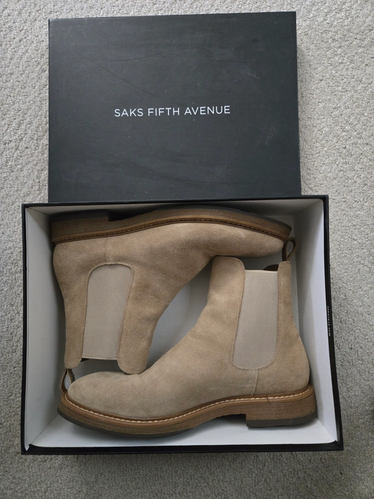 Selling a pair of Saks Fifth Avenue Chelsea boots in a lovely suede material. They come with the original box!
