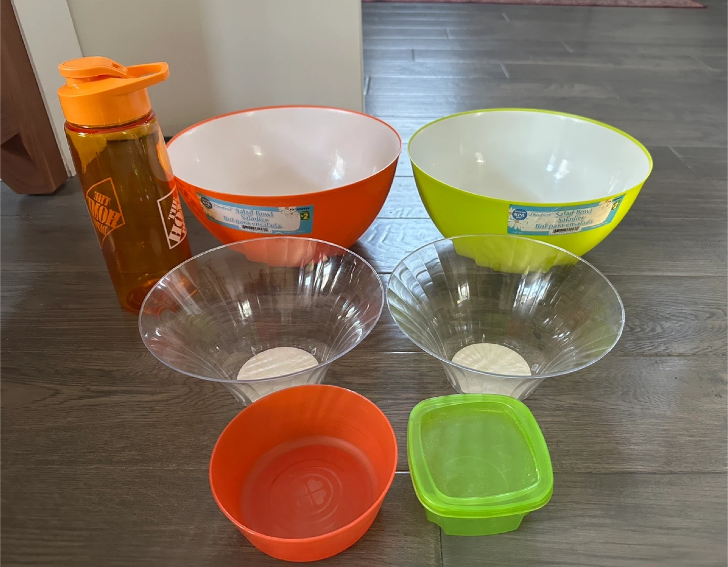 Selling a set of salad bowls and a water bottle from Home Depot. The set includes two large salad bowls (one orange, one green), two smaller clear bowls, a small orange bowl, a small green container, and an orange water bottle. Great for picnics or everyday use! All new items - never used - the lot for $5