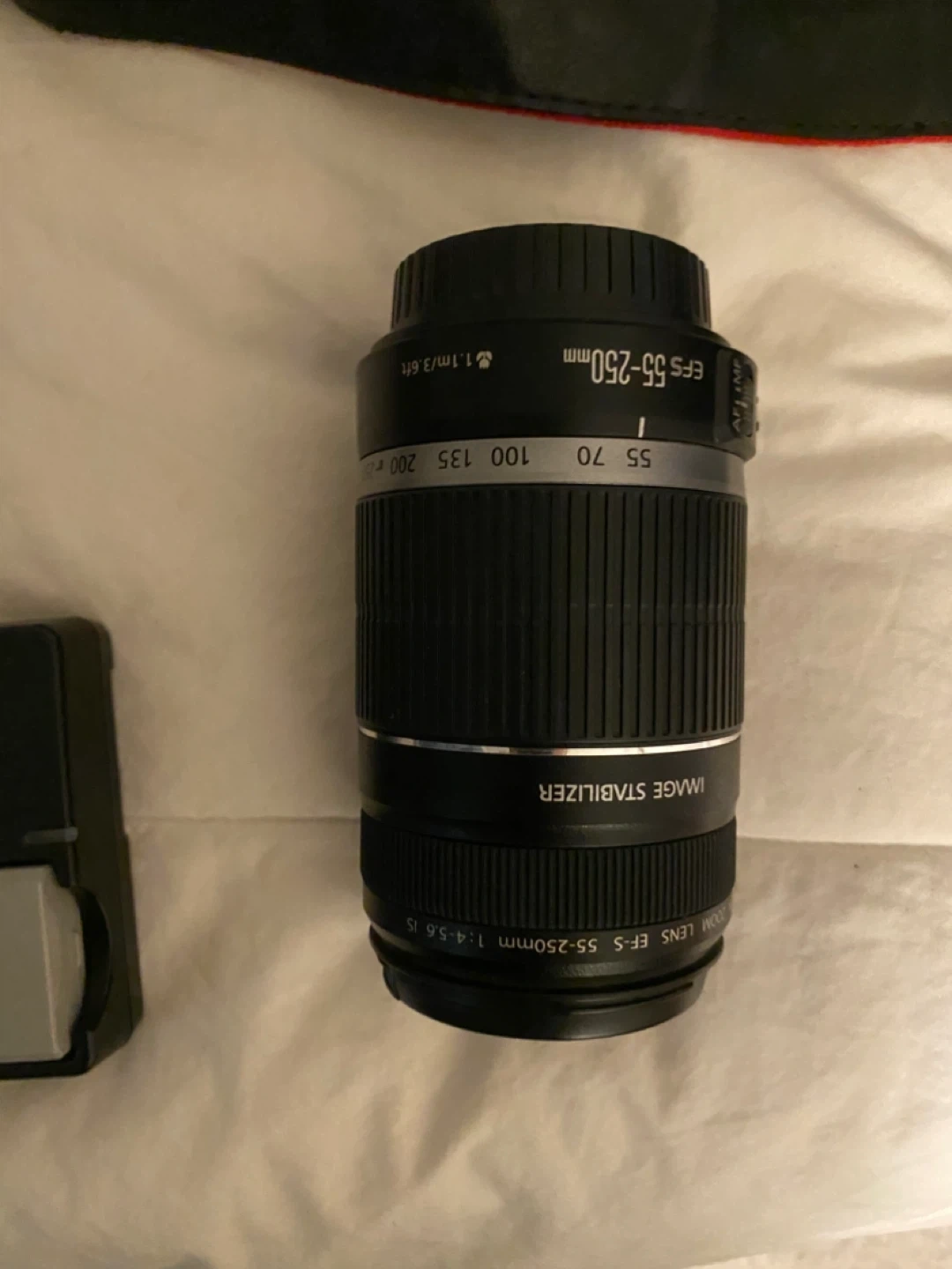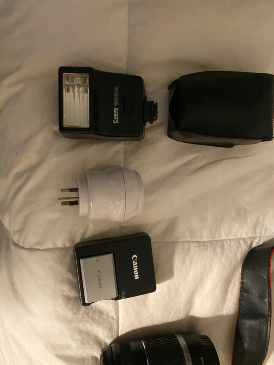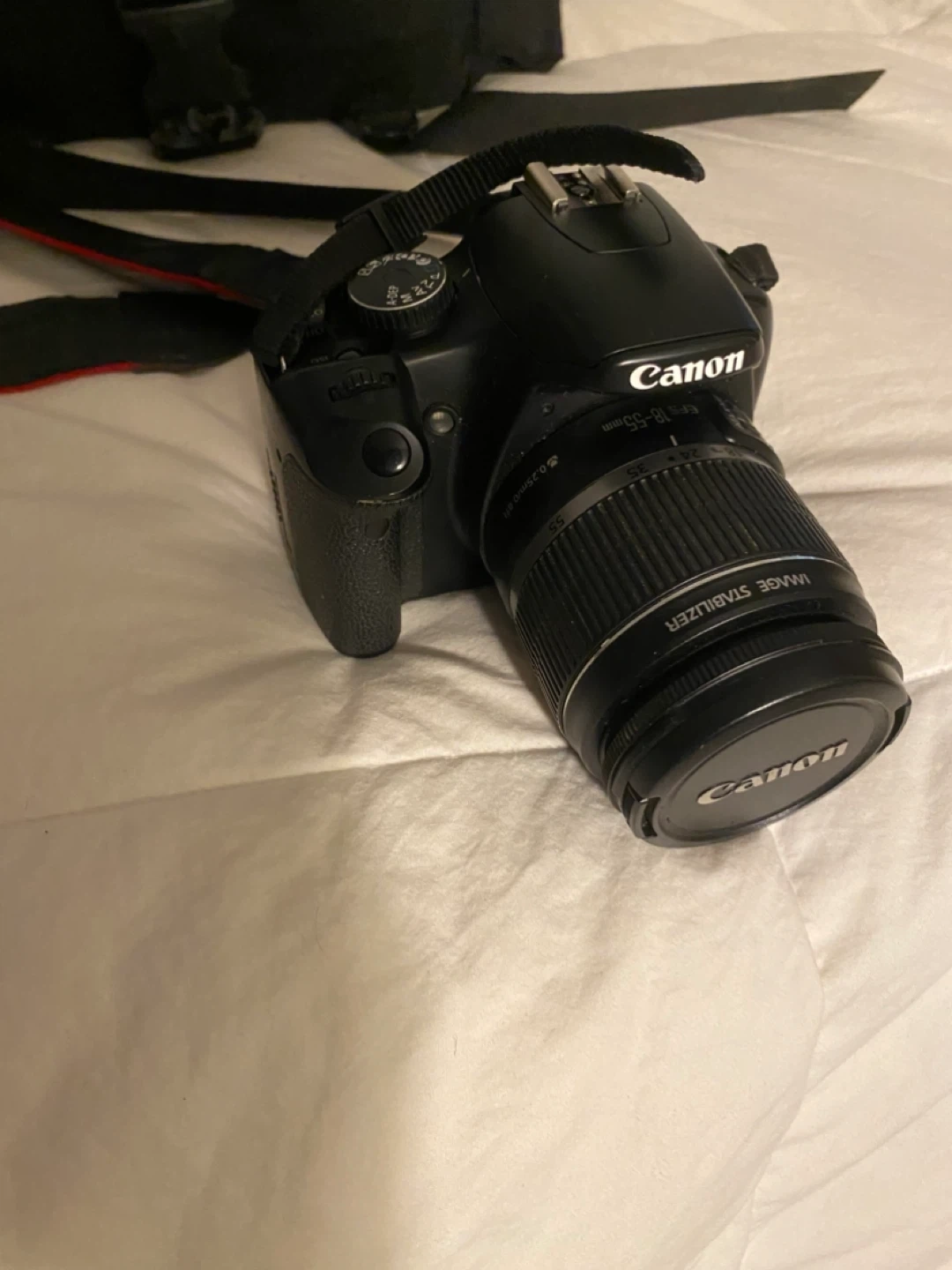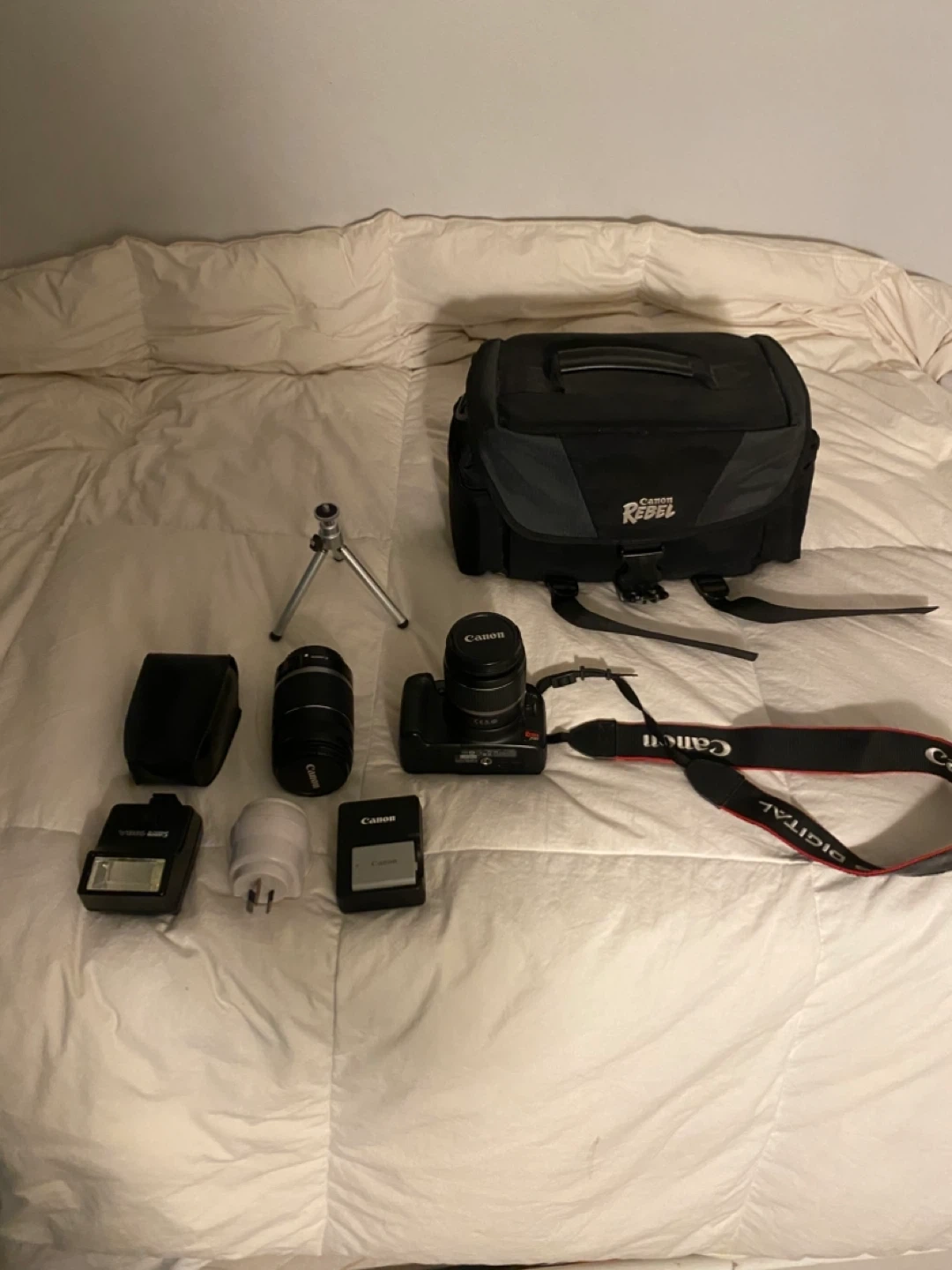 Selling a Canon Rebel camera in good condition. It comes with two lenses: an EF-S 18-55mm lens and a 55-250mm lens. Also included is a flash, charger, and camera bag. Great for anyone starting out in photography!