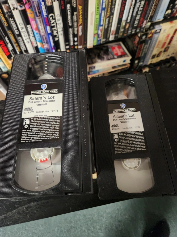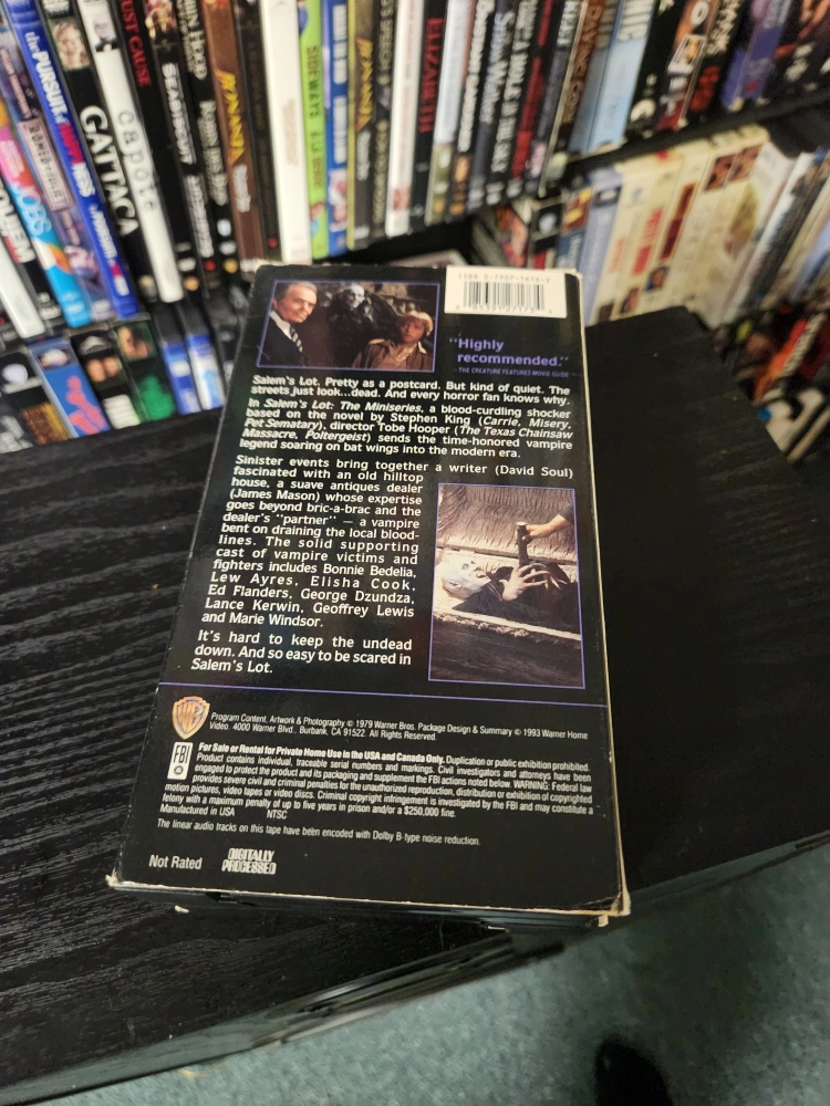 Selling a VHS copy of Salem's Lot Full-Length Miniseries. It's in good condition for its age! The tape is a Warner Home Video release. Perfect for any horror fan or collector of vintage media