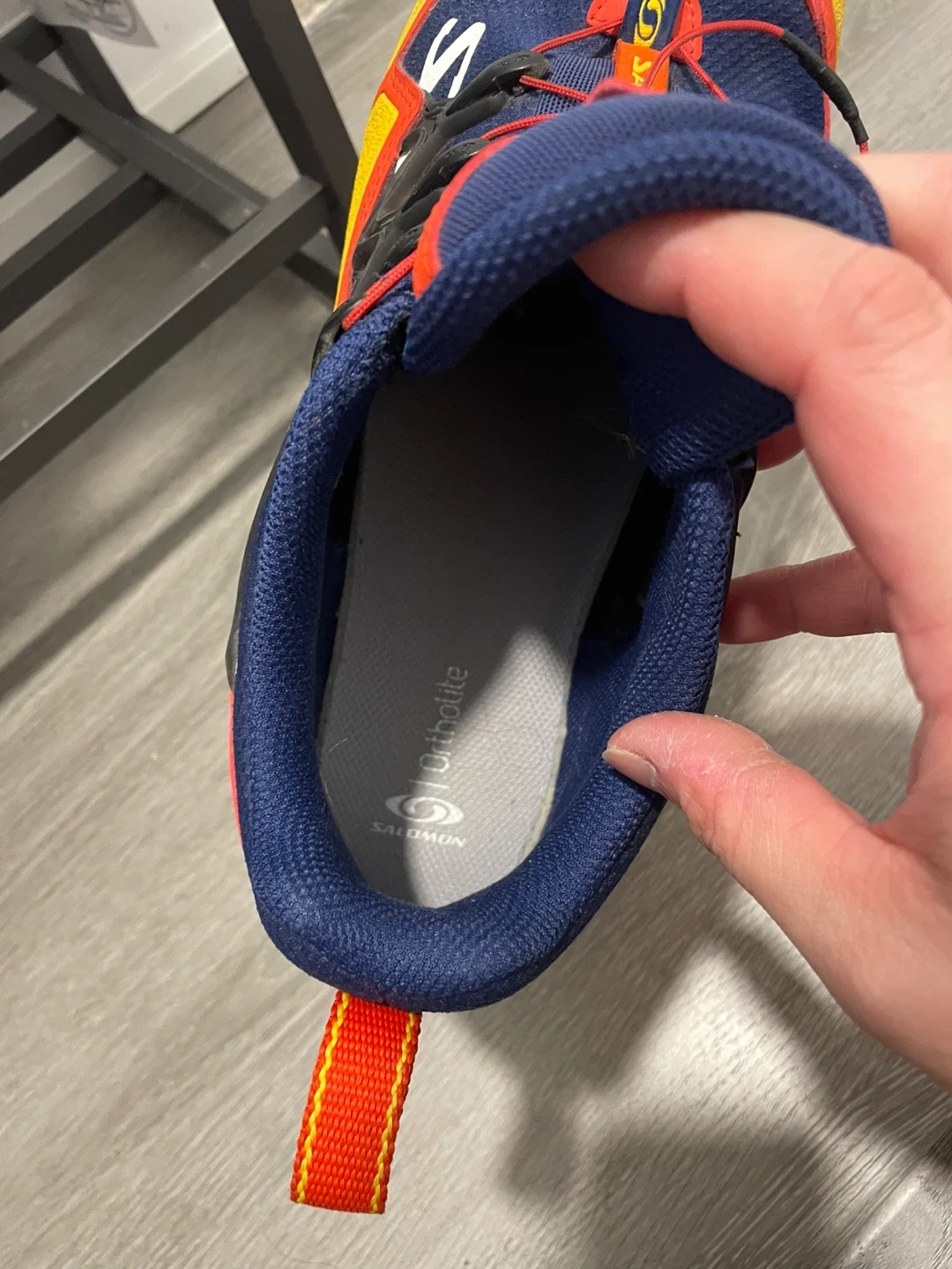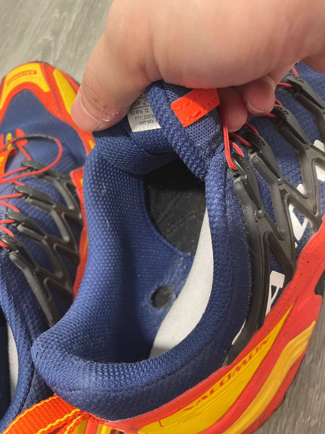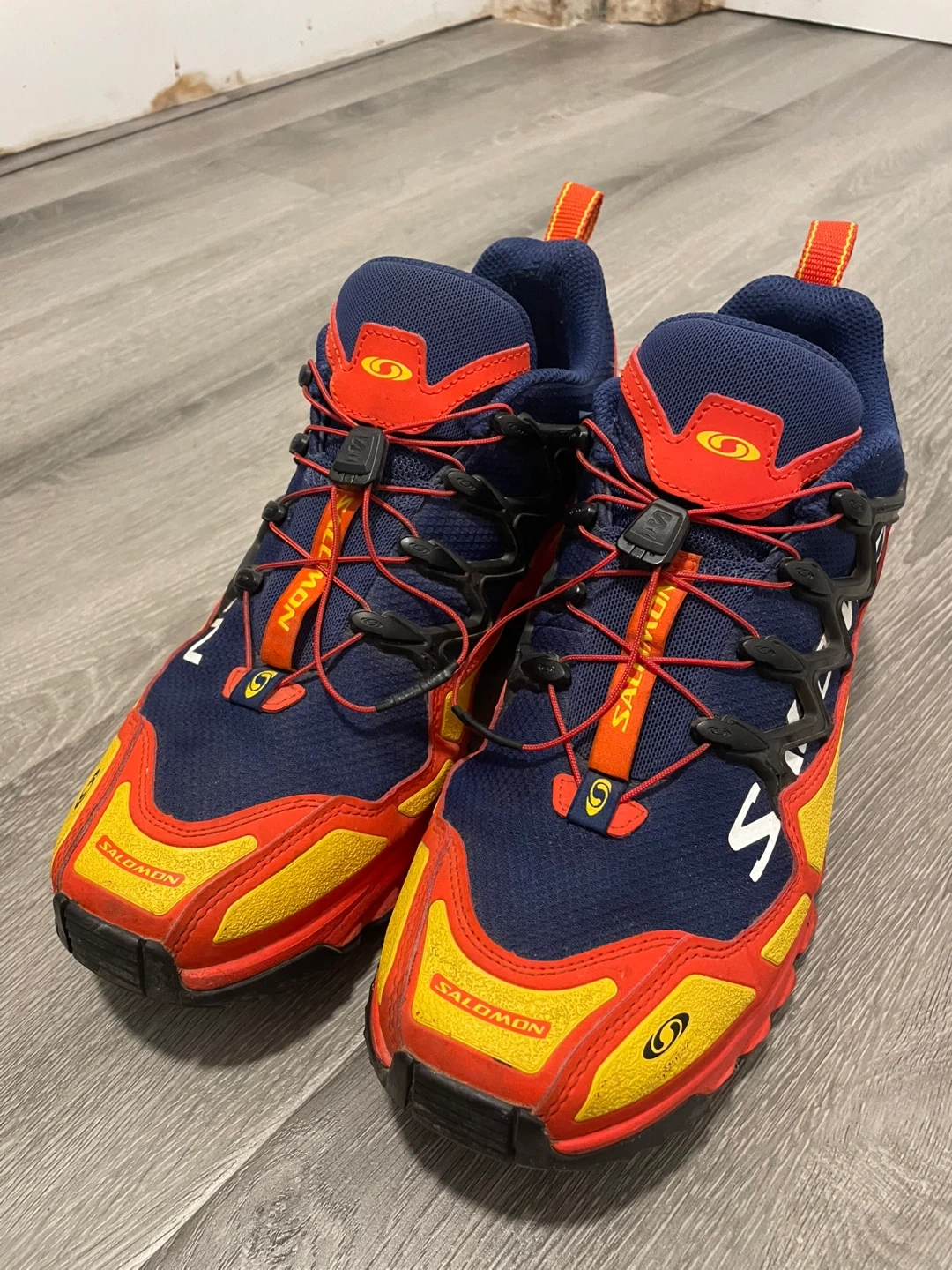 Selling a pair of Salomon trail running shoes! They feature a vibrant colourway of blue, red, and yellow. The insoles are Ortholite for extra comfort on the trails. Perfect for your next outdoor adventure!