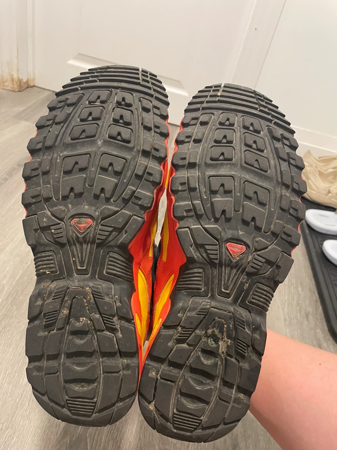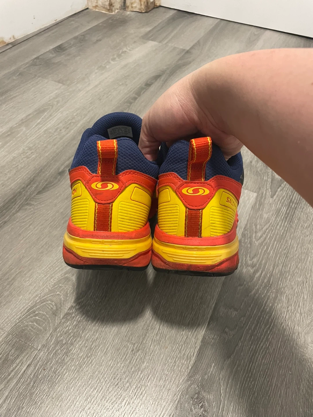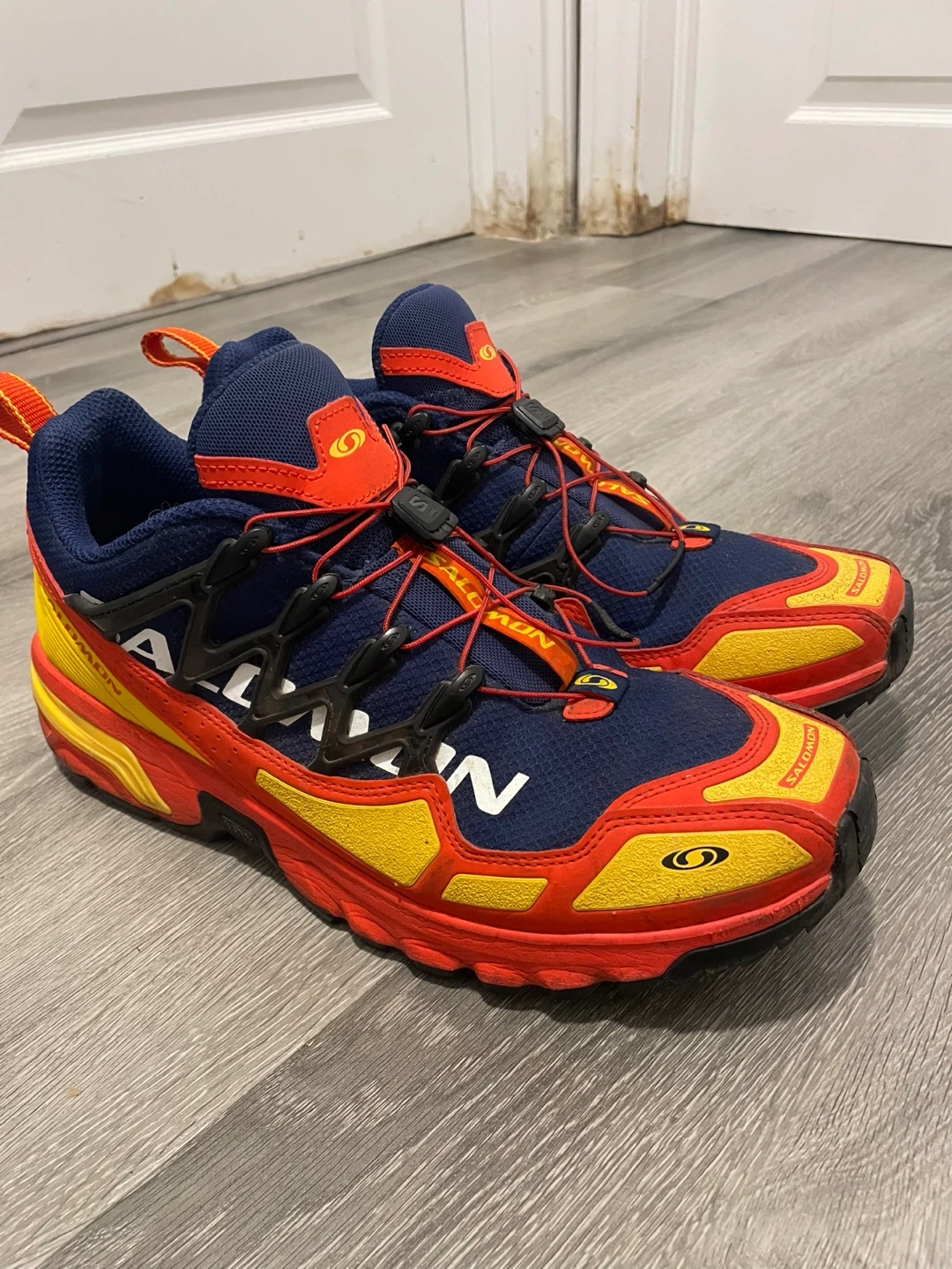 Selling a pair of Salomon trail running shoes! They feature a vibrant colourway of blue, red, and yellow. The insoles are Ortholite for extra comfort on the trails. Perfect for your next outdoor adventure!