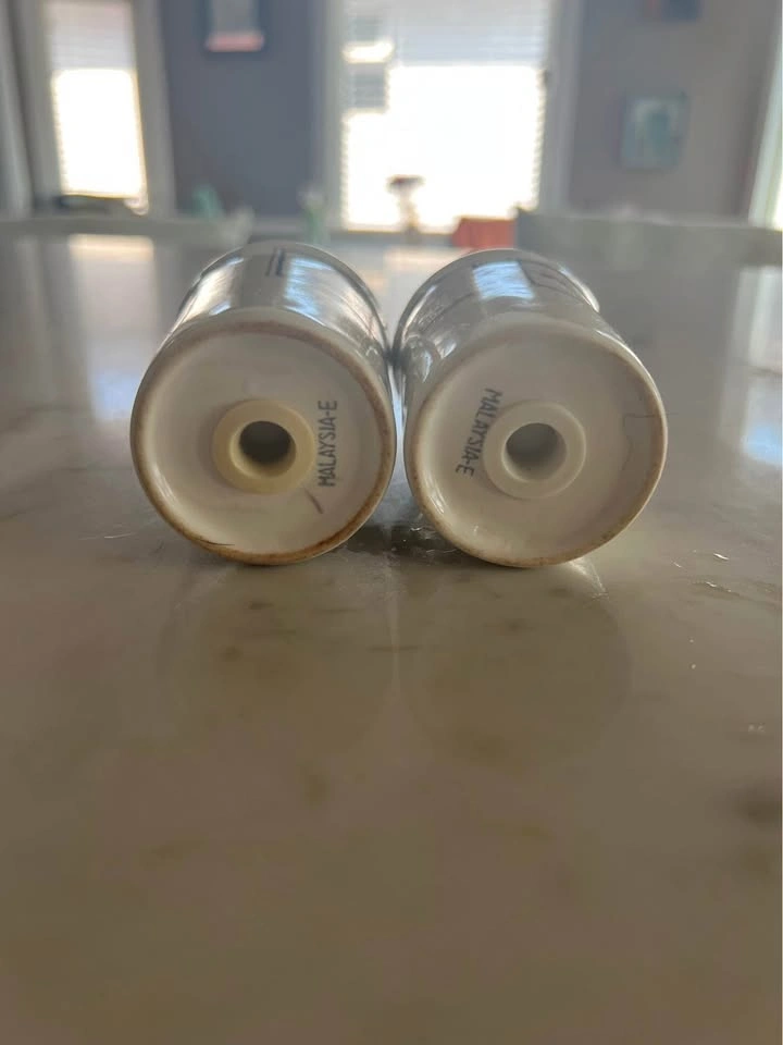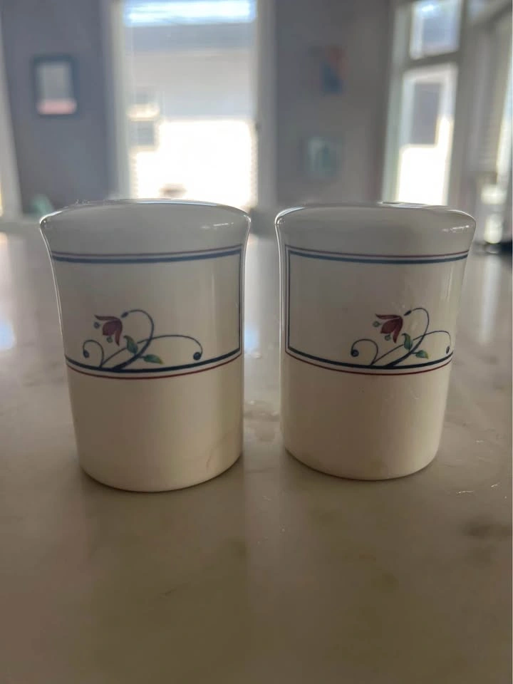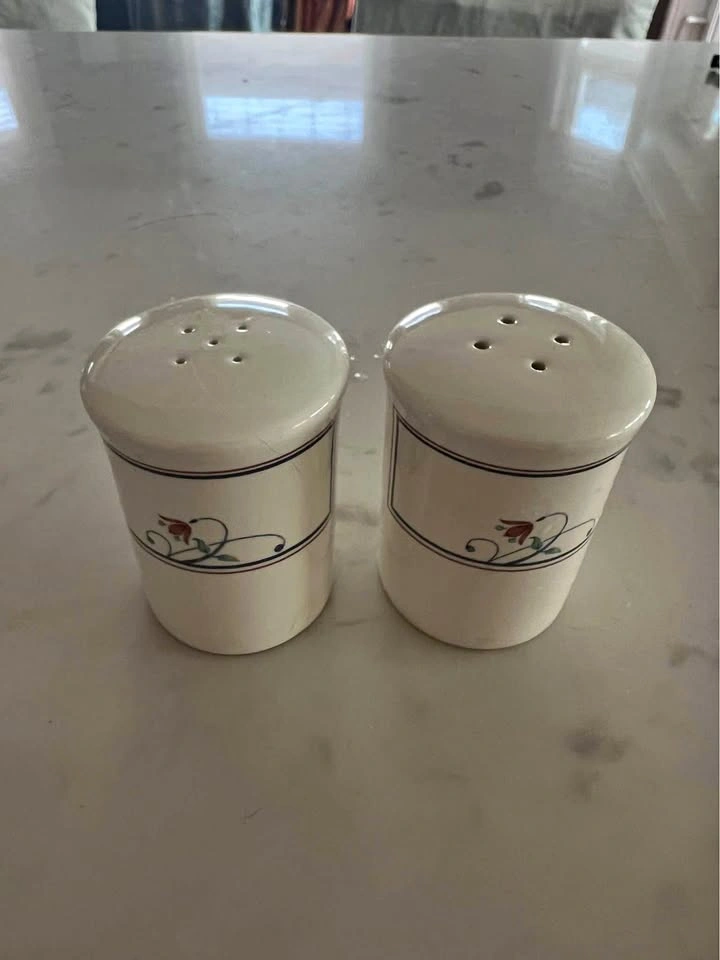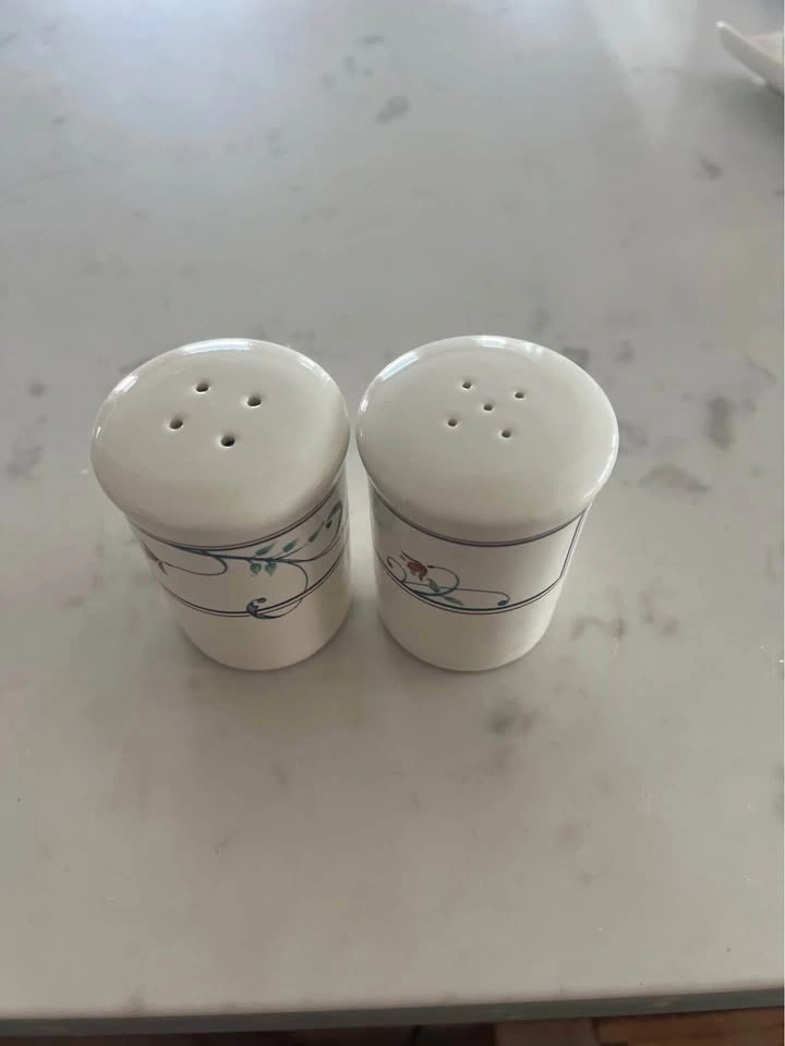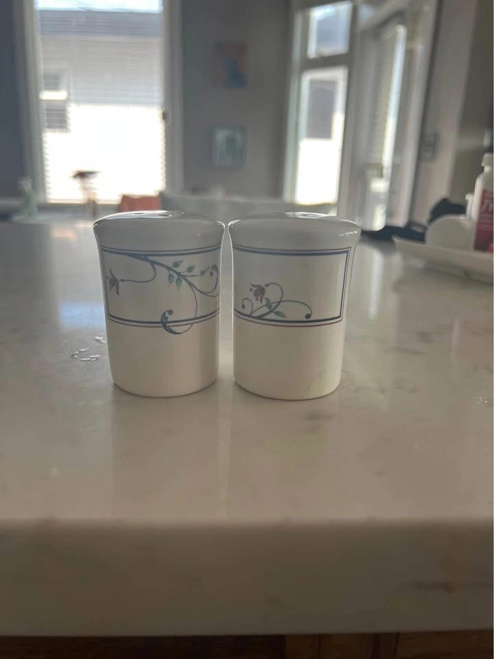 Cute white salt and pepper shakers with blue flowers. Barely used. Cleaned.