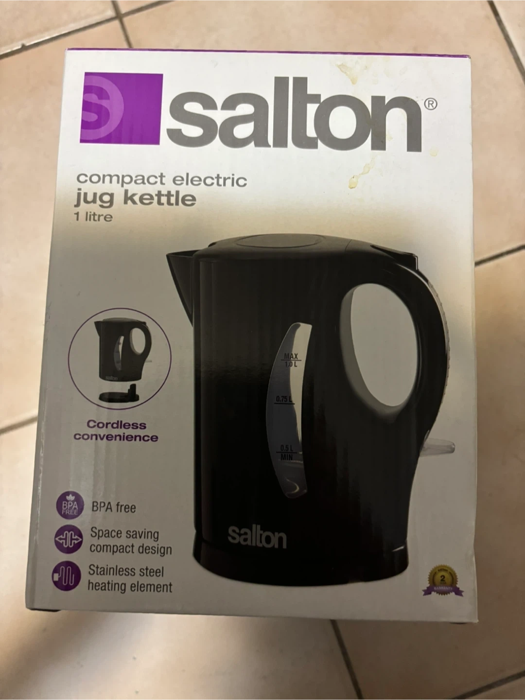 Selling a Salton compact electric jug kettle with a 1-litre capacity. It features cordless convenience, a BPA-free design, and a stainless steel heating element. The kettle also has a space-saving compact design. It's in great condition and ready for a new home. Only used for a month and it’s been sitting in a box since.