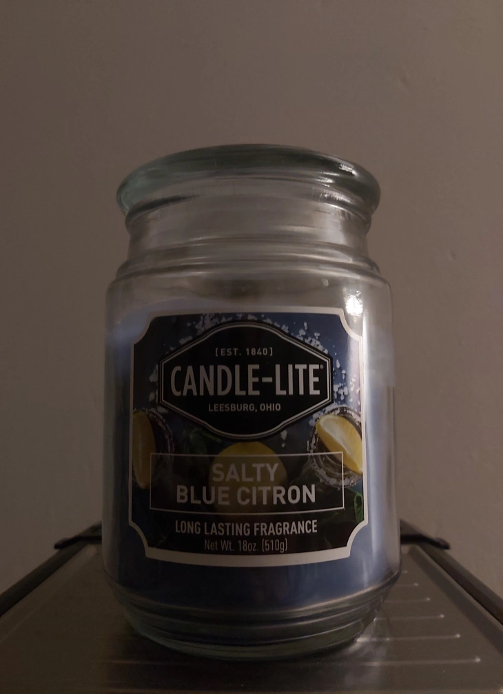 A Candle-Lite scented candle with a blue label and a glass jar 🧡