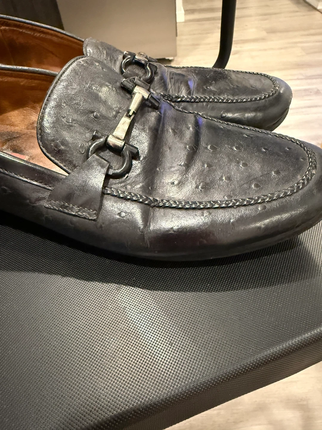 Selling a pair of Salvatore Ferragamo loafers in black leather. They show some signs of wear but are still in good condition. Classic and stylish!