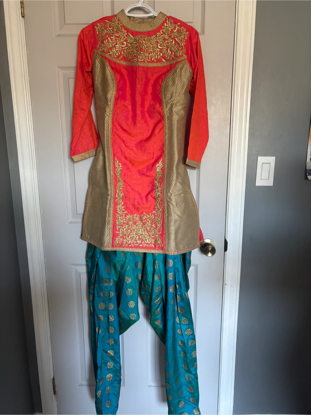 Selling a beautiful salwar kameez suit! The colours are vibrant, with orange and blue hues. The intricate gold detailing adds a touch of elegance. Perfect for a special occasion or cultural event
