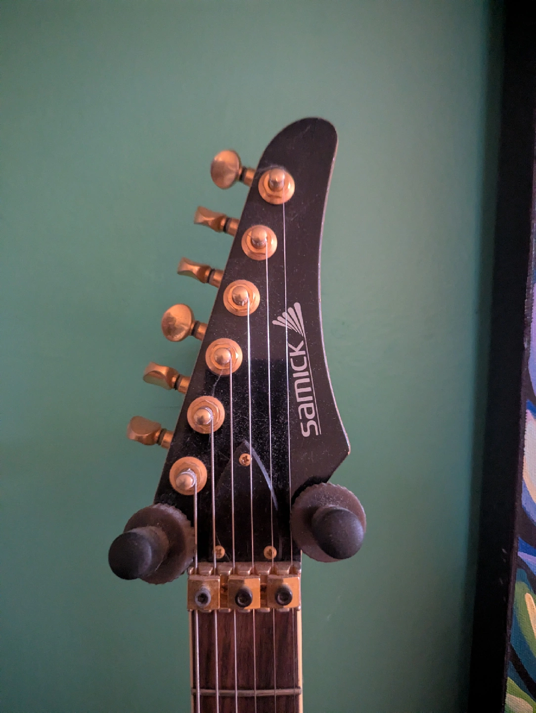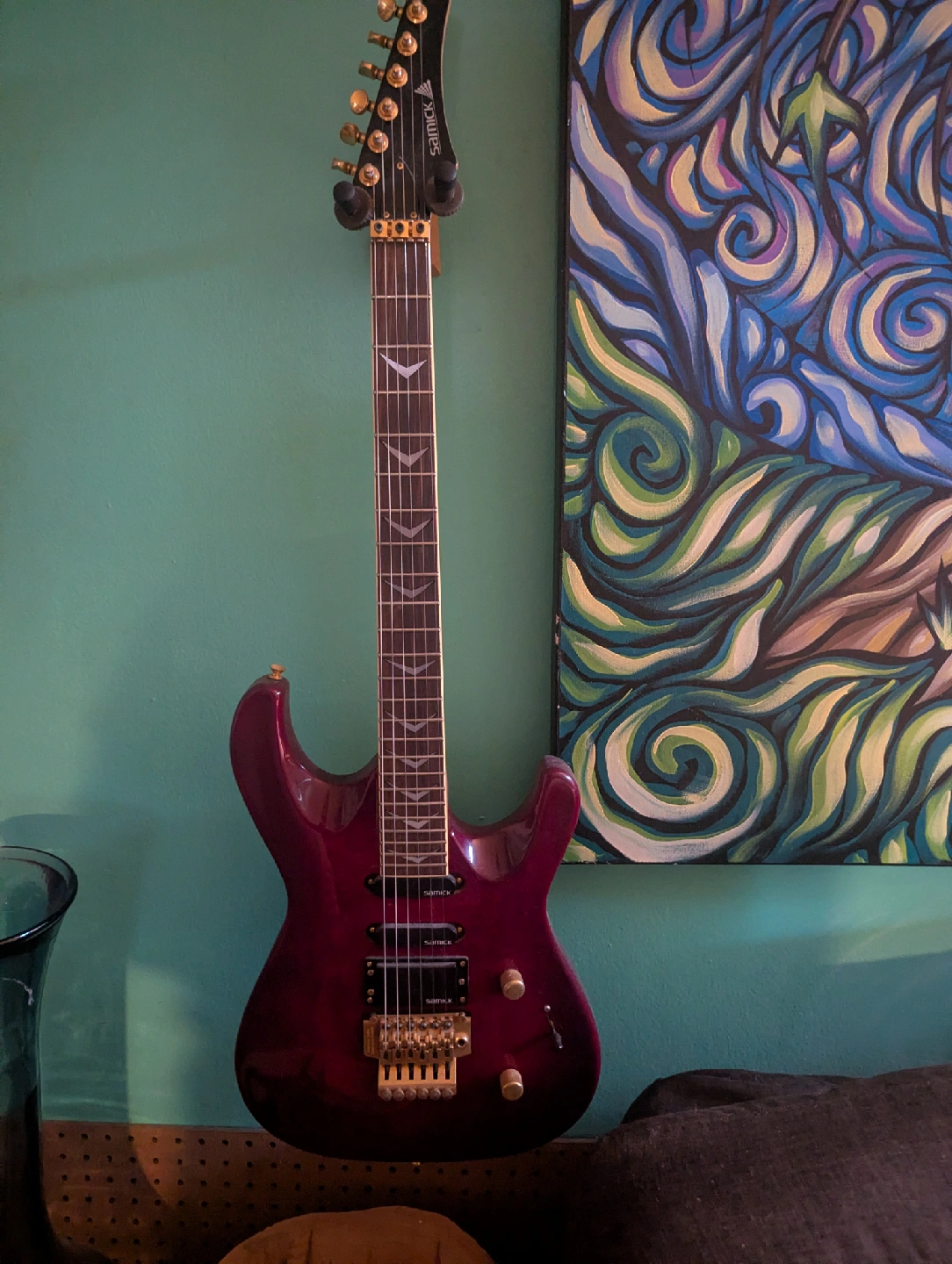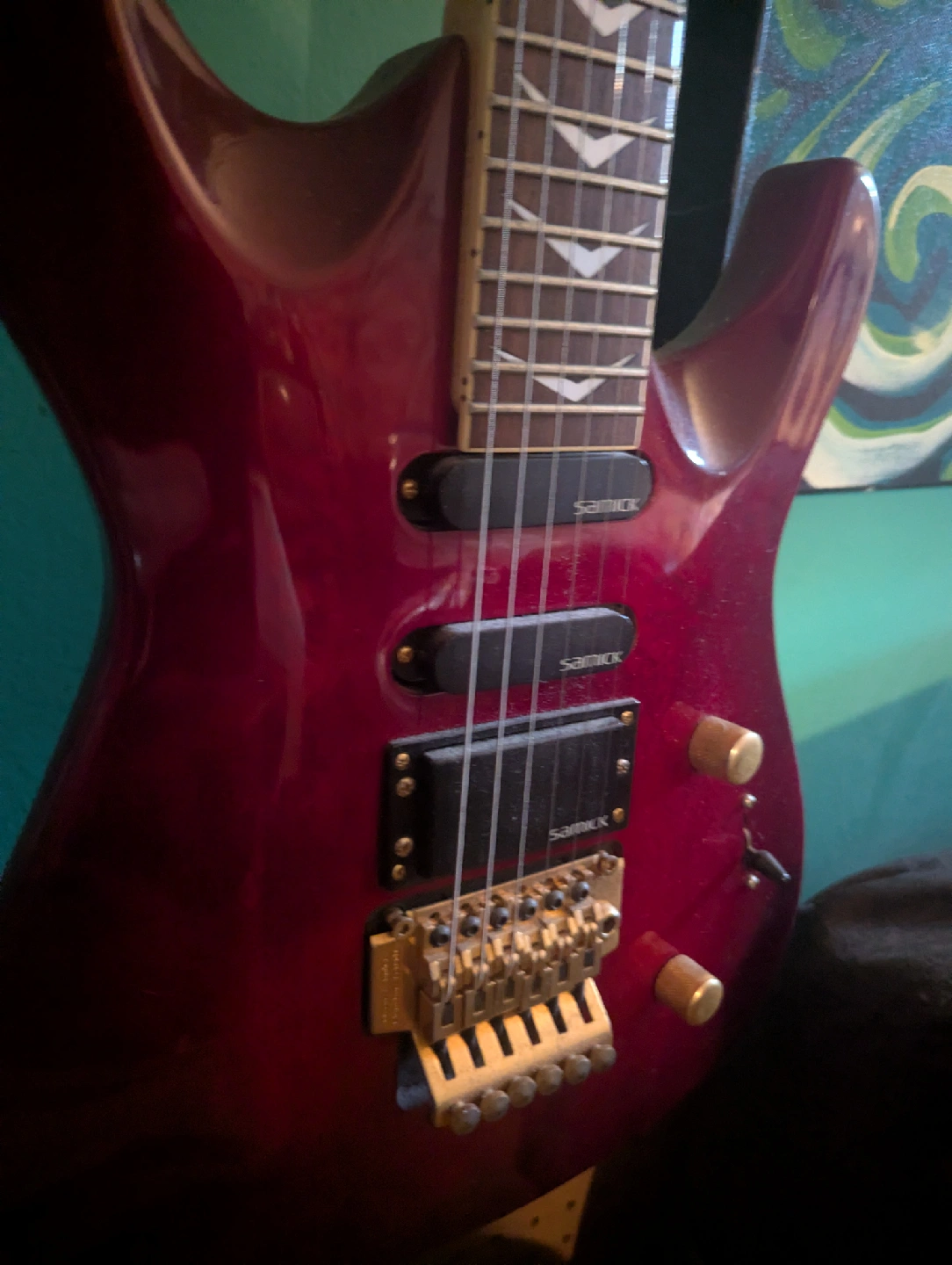 Selling a Samick electric guitar in a beautiful burgundy finish. It's in great shape and ready to be played! The gold hardware adds a touch of elegance to its overall look. Perfect for anyone looking for a reliable and stylish instrument