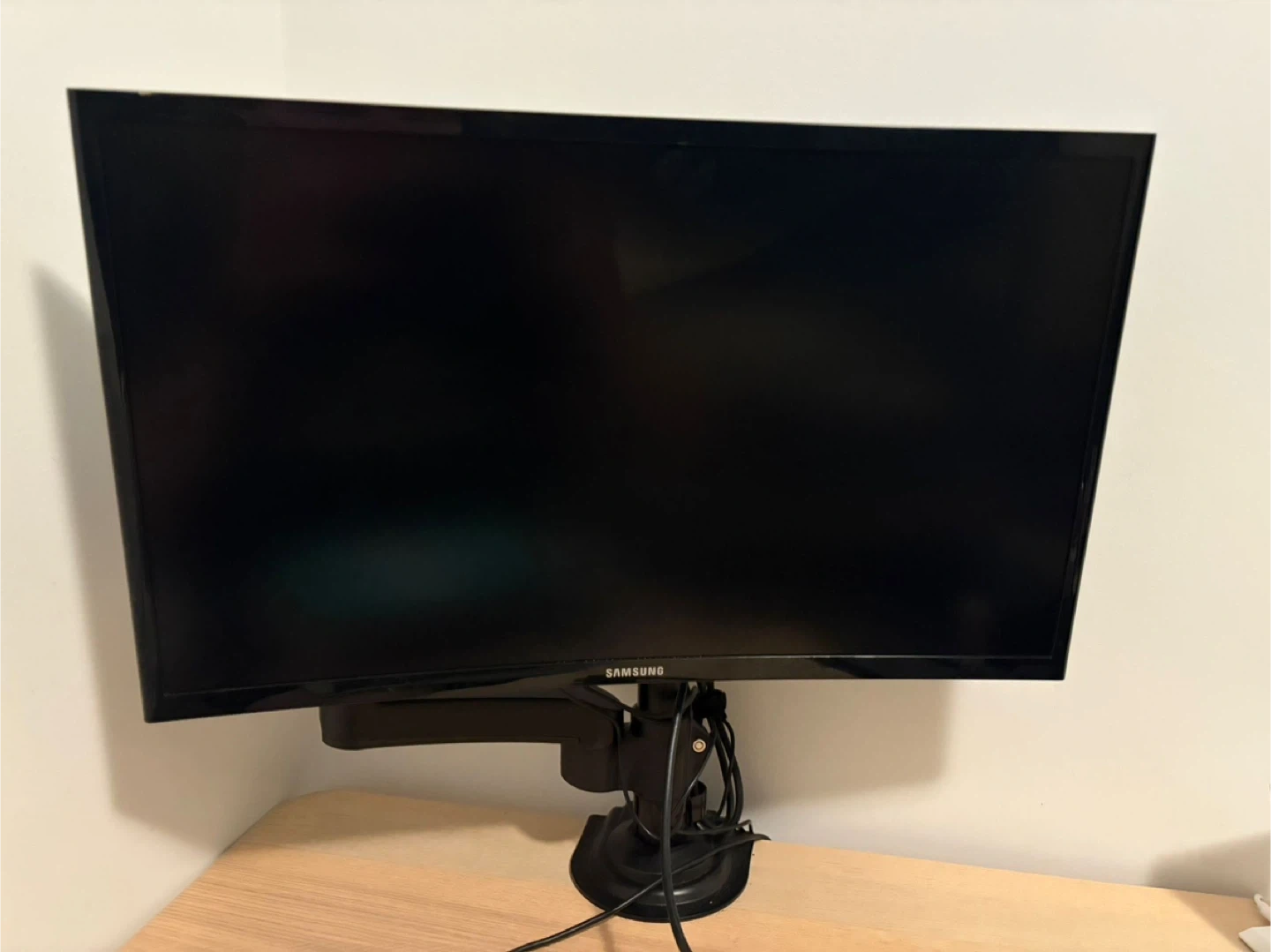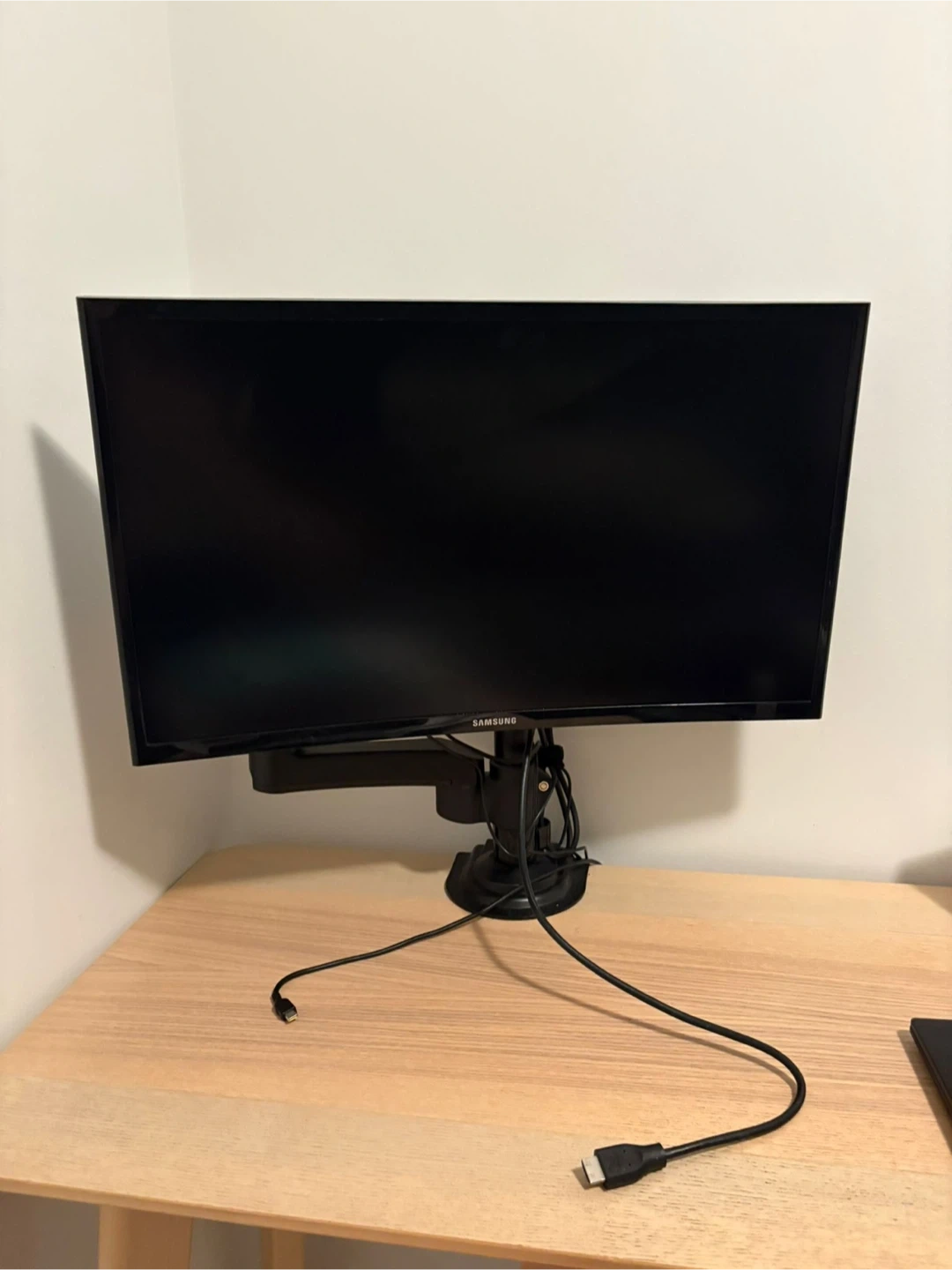 Selling a Samsung 24-inch curved gaming monitor (model LC24F390FHNXZA) with a super slim design. It's paired with a HUANUO single monitor arm, which is adjustable and fits 13-34 inch screens. The monitor arm holds up to 19.8 lbs and has full motion swivel. Worth $250. Perfect for a clean and ergonomic setup!