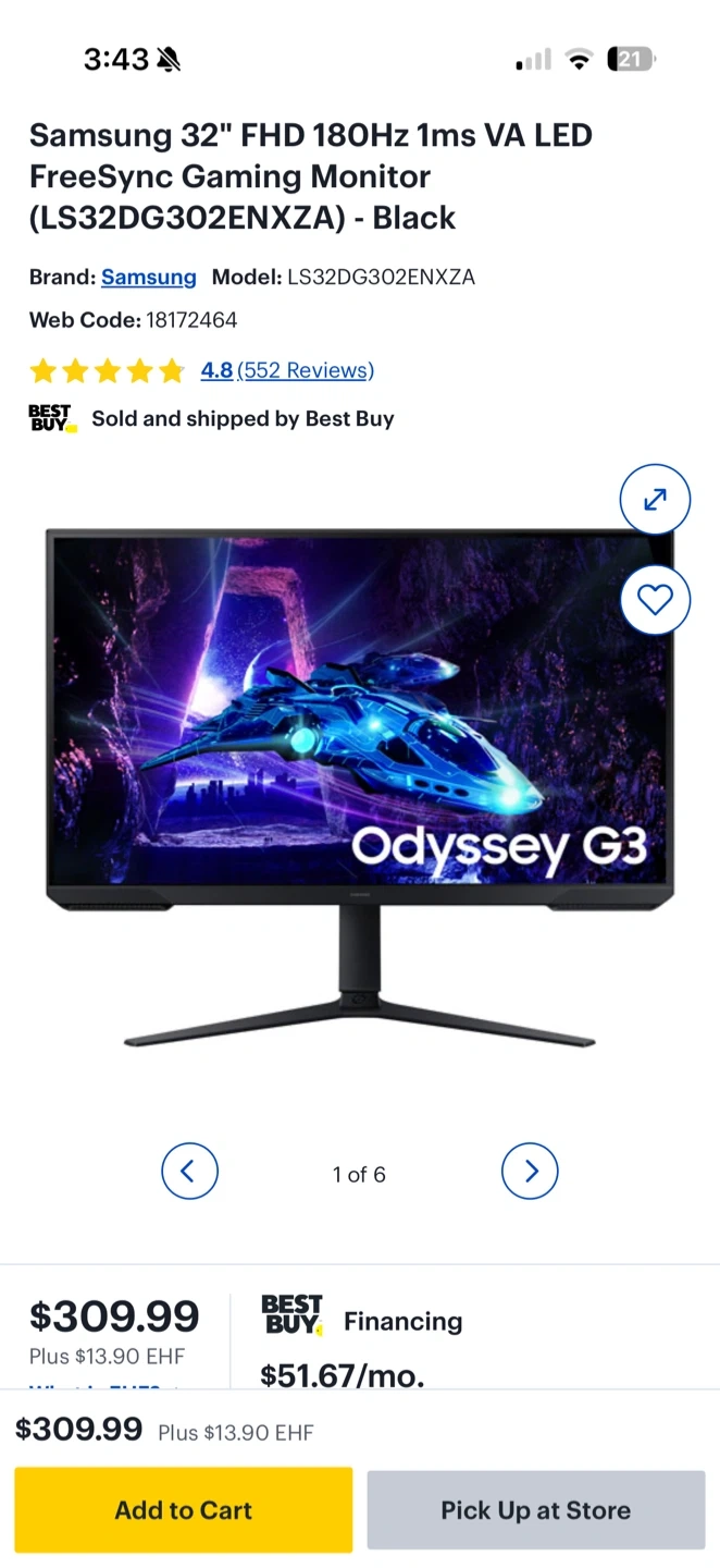Selling a Samsung 32" FHD 180Hz 1ms VA LED FreeSync Gaming Monitor (LS32DG302ENXZA) in black. It's in great condition and ready for a new home. It was originally bought for $309.99 at Best Buy. I’m moving to QHD so I’m selling in good price.