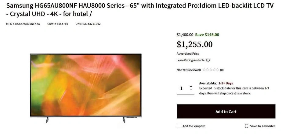 Samsung HG65AU800NF HAU8000 Series 65" LED-backlit LCD TV with Integrated Pro:Idiom. Quick specs: 65" Diagonal Class HAU8000 Series LED-backlit LCD TV hotel / hospitality with Integrated Pro:Idiom Tizen OS HDR Crystal UHD Smart TV 4K UHD (2160p) 3840 x 2160 Aspect Ratio 16:9 Backlight Technology LED backlight Features Energy Saving Mode (BLU control), H.Browser compatible, Hospitality Home Menu 2.0, Hospitality Plug & Play (Easy Set-up), Hotel Channel List, Mixed channel list, Power On Mode, Samsung LYNK Cloud, Samsung LYNK DRM, Security Mode Pro:Idiom Compatible Yes Screen Resolution 3840 x 2160 Settings Cloning Capability Yes Television Diagonal Class 65 inch Television Modes Ambient Mode, Film Mode Vertical Viewing Angle 178° Let me know if you're interested!