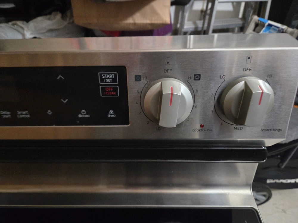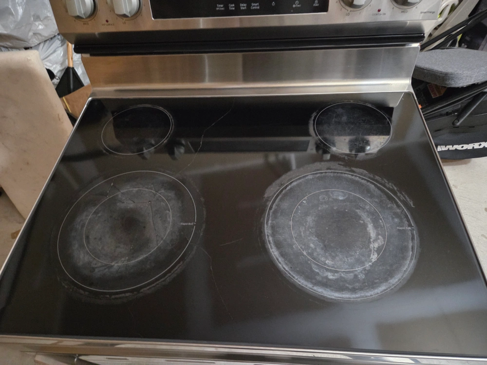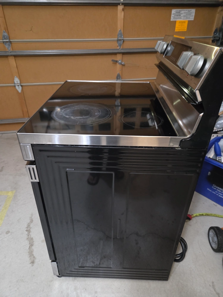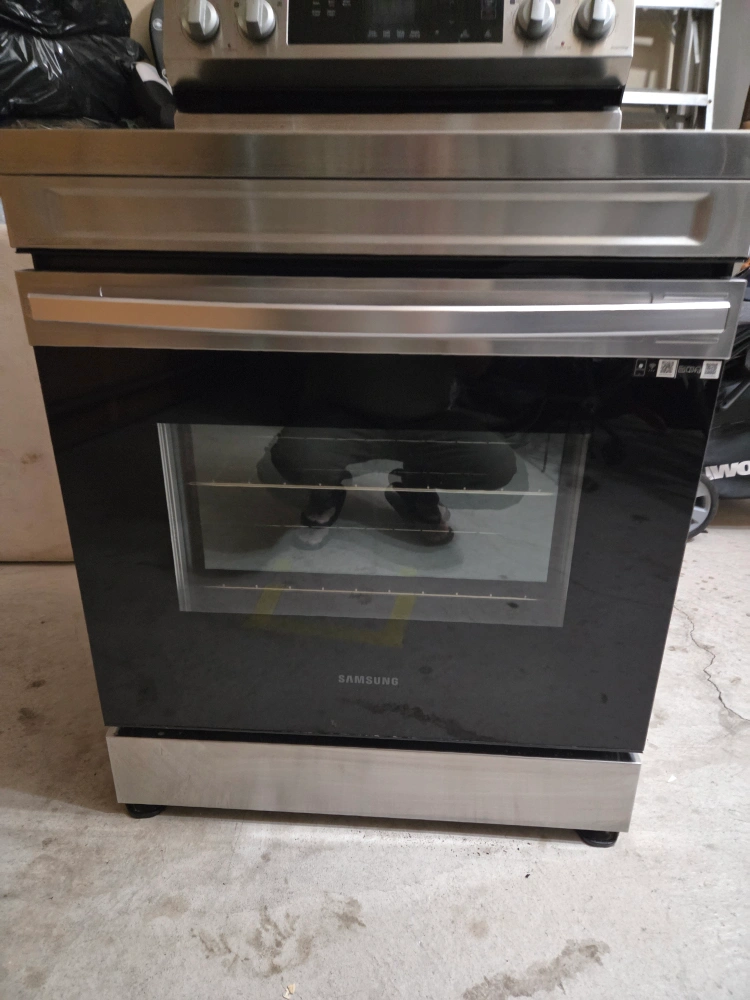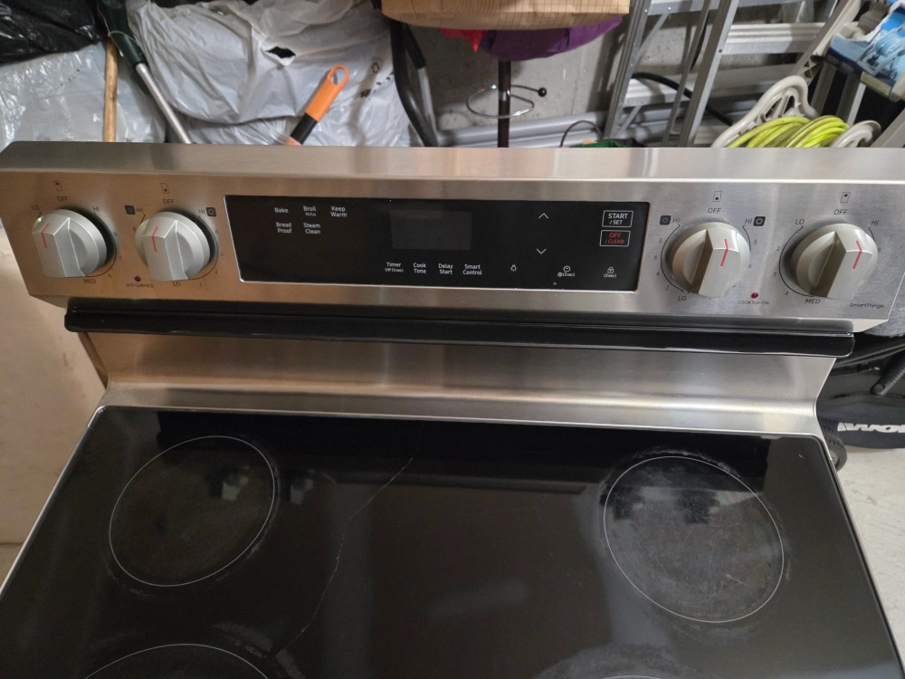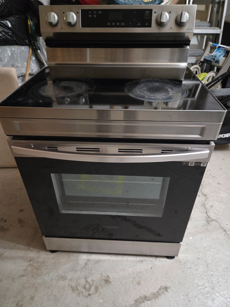 Selling a Samsung electric range oven. It's in good condition and ready for a new home. The cooktop has four burners and the oven is spacious. Perfect for cooking up your favourite meals! top glass has crack but working condition ok