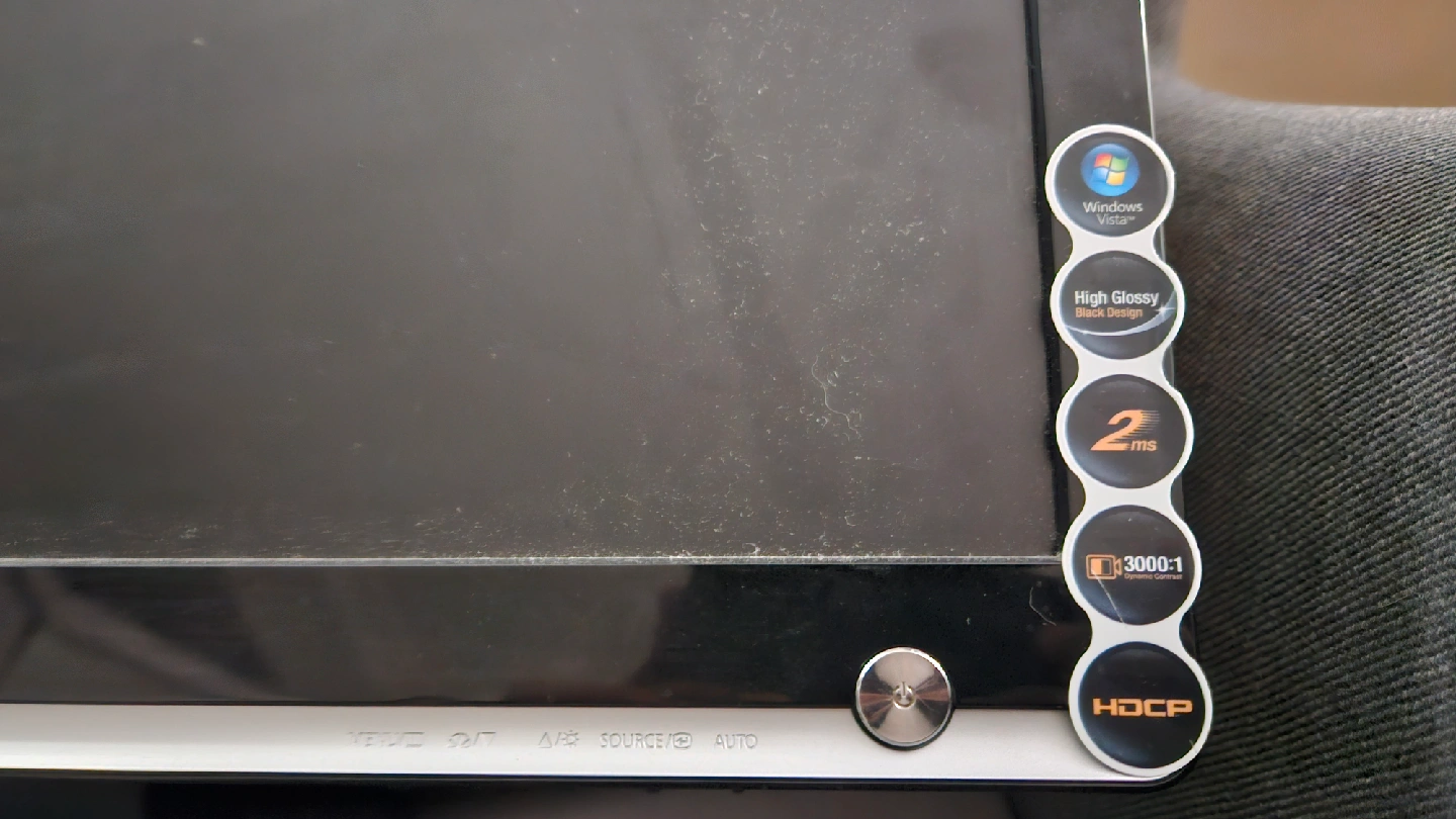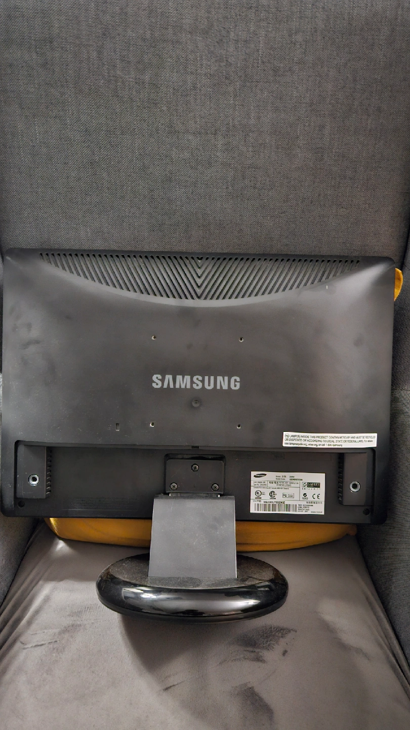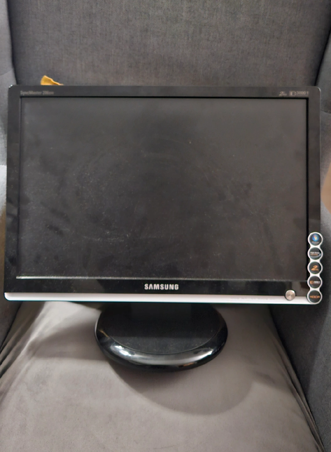Selling a Samsung SyncMaster 206BW LCD monitor. It features a high glossy black design and a response time of 2ms. The contrast ratio is 3000:1, with 50/60hz. (THE SCREEN IS BLOWN OUT; NEEDS TO BE REPAIRED)