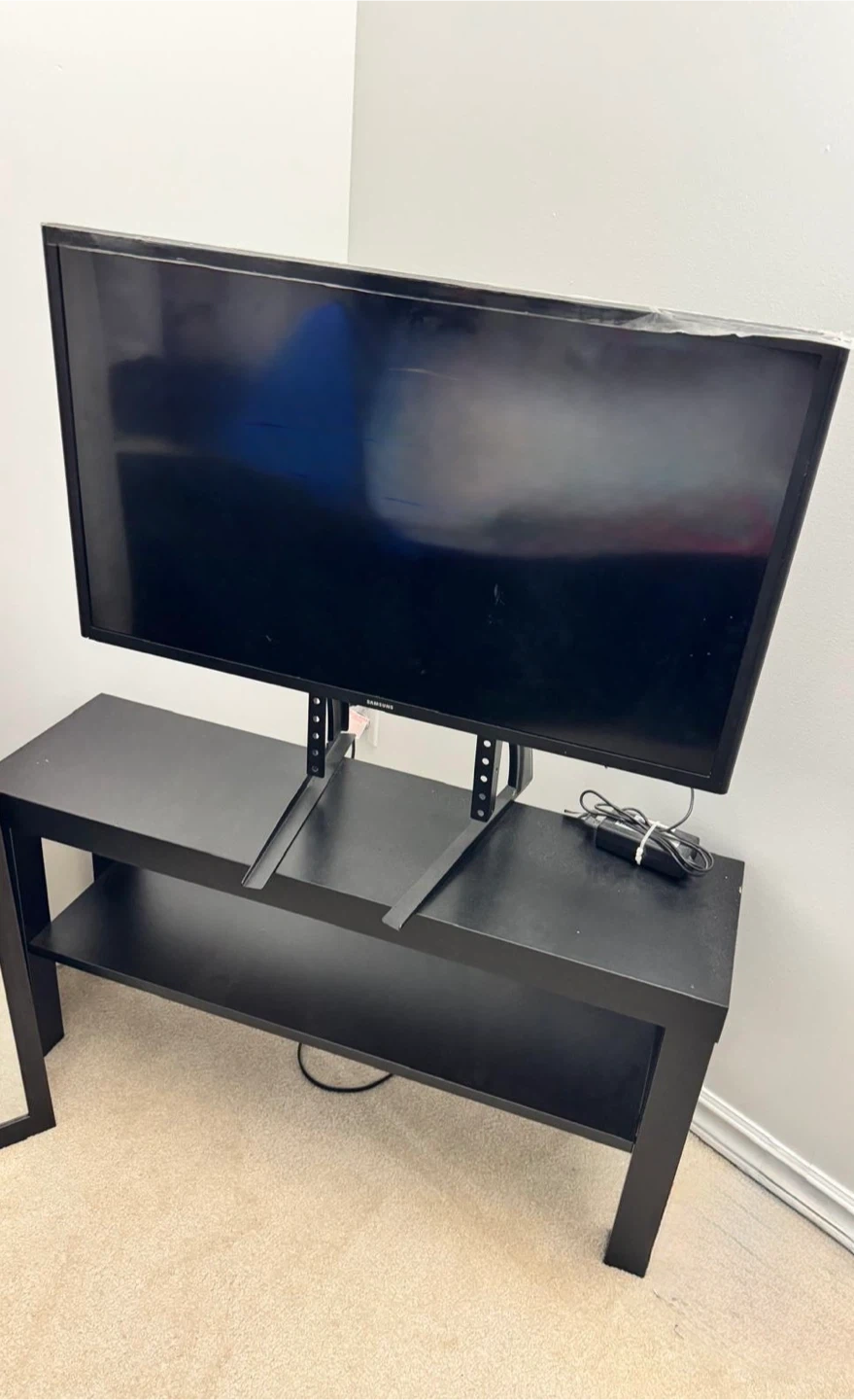 Selling a Samsung TV 32 inch smart tv with a sleek black TV stand! It would be perfect for a living room or bedroom setup. The TV comes with the stand provides a nice, sturdy base with some storage space below.