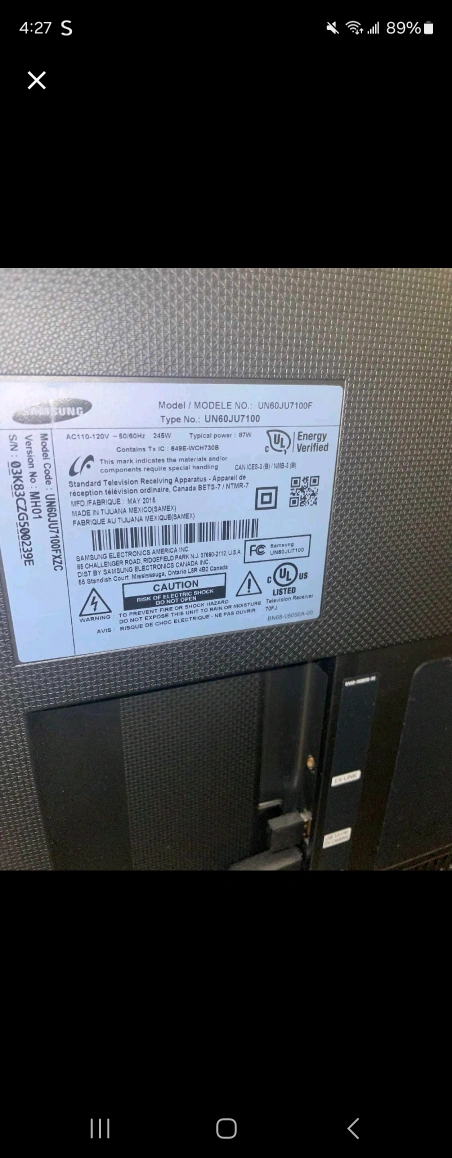 Selling a Samsung 60-inch TV, model number UN60JU7100F. It's in good working condition and ready for a new home! It operates at AC110-120V, 50/60Hz, and 245W. Feel free to ask any questions!