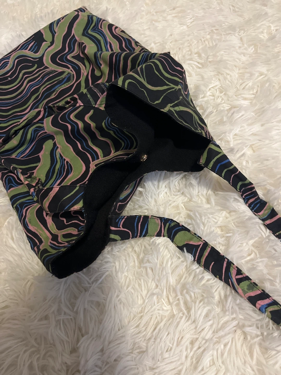 Looking to sell my Sanself tote bag! It's black with a really unique colourful pattern. It's in great condition and perfect for carrying your everyday essentials. The inside is black and has a pocket too!