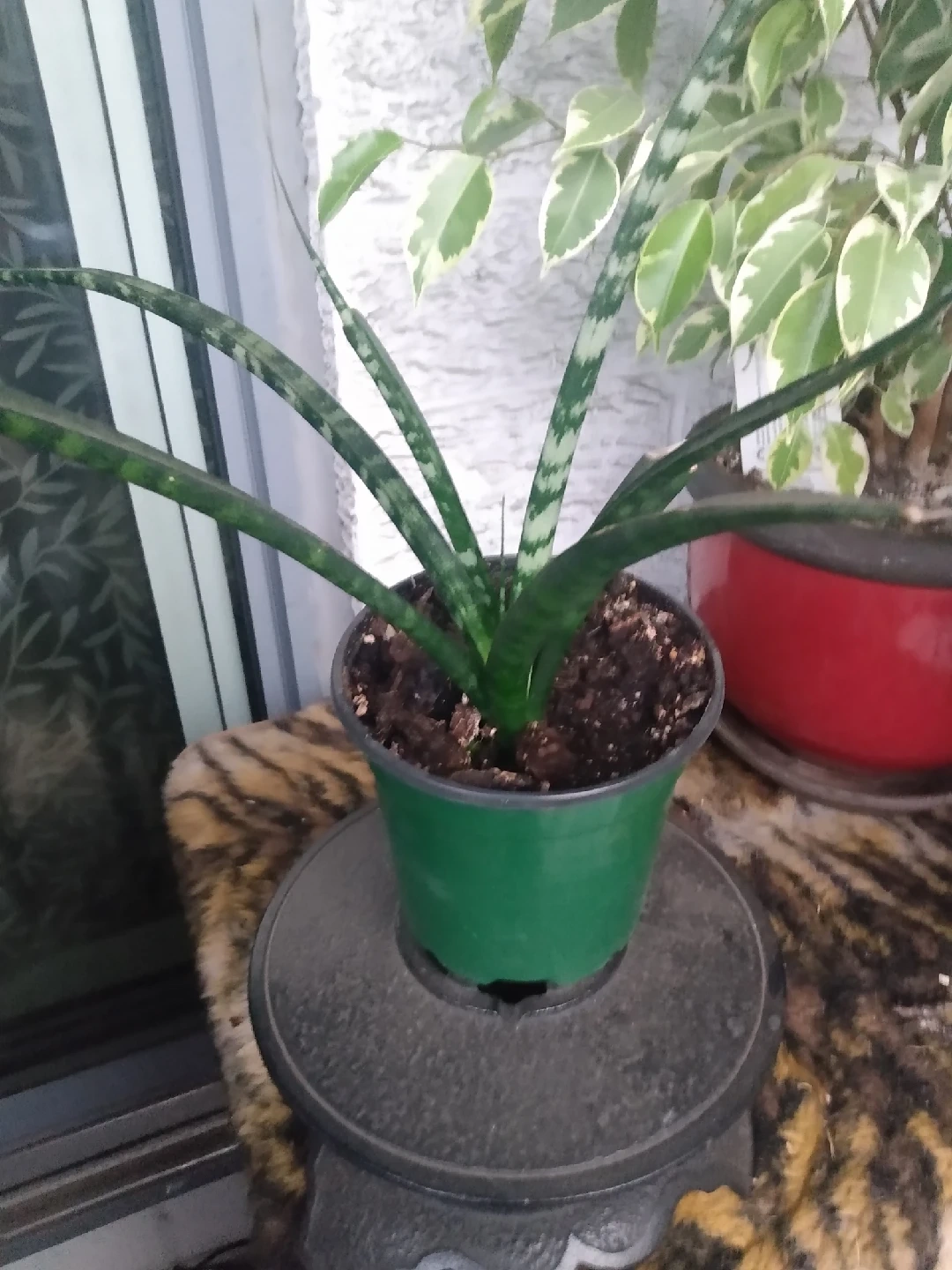 Selling a healthy snake plant in a green pot! It's a great low-maintenance plant that's perfect for adding some greenery to your home. Easy to care for and helps purify the air. I have 3