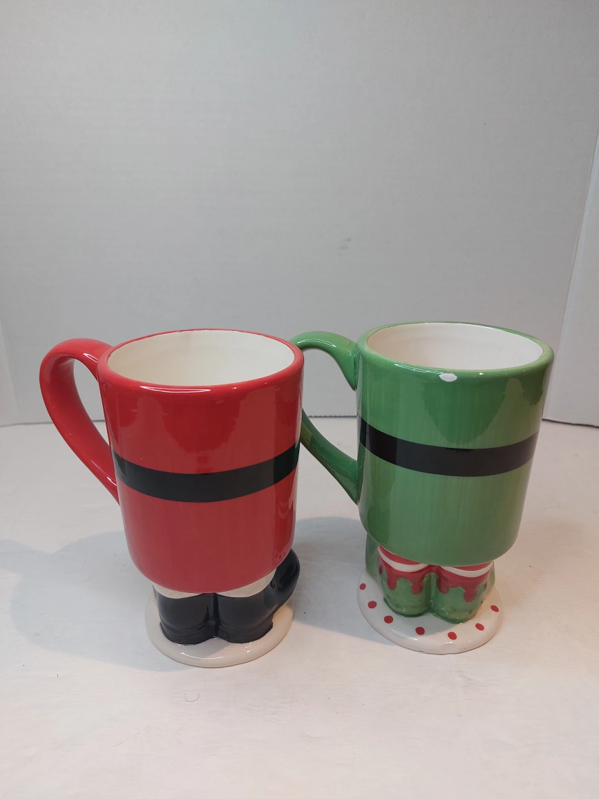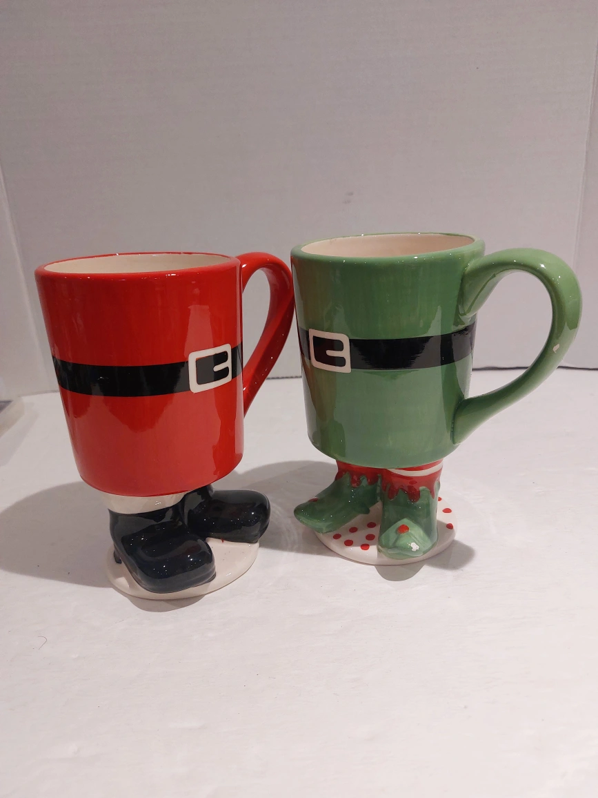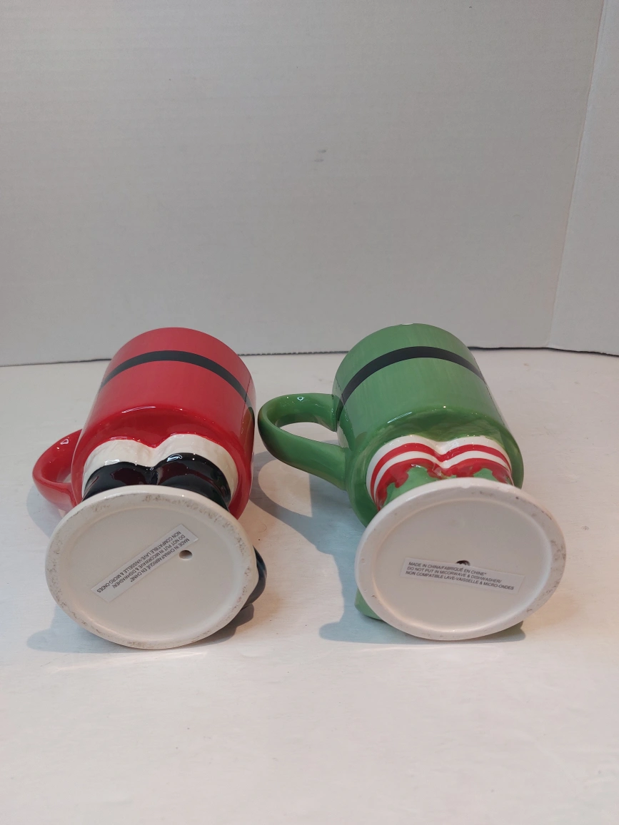 Santa & Elf Ceramic Christmas Mugs - Set of 2 Here's a fun set of two Christmas mugs! One is a Santa mug (red) and the other is an elf mug (green). They're in great condition and ready for your holiday hot chocolate!