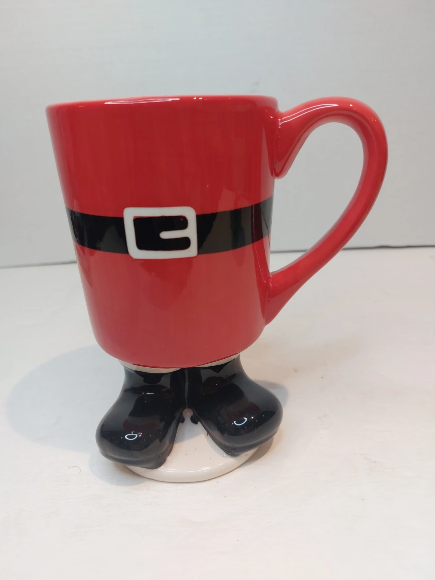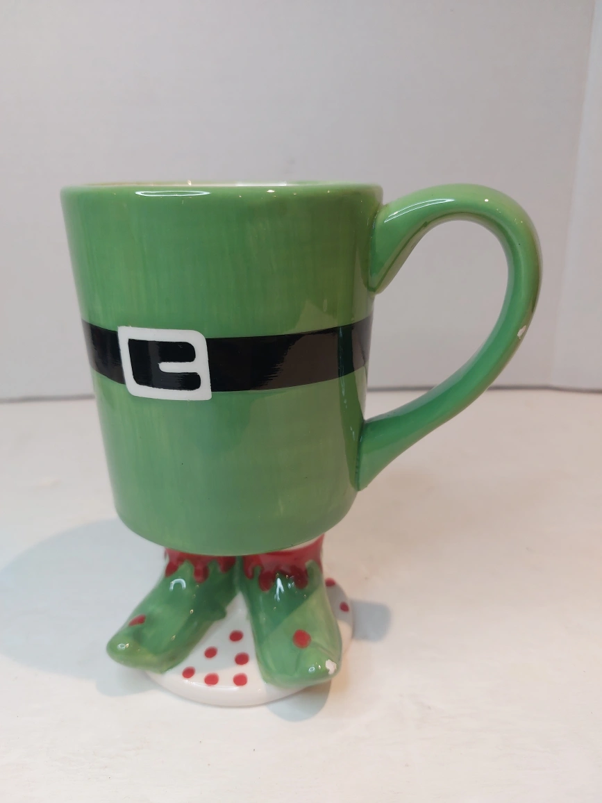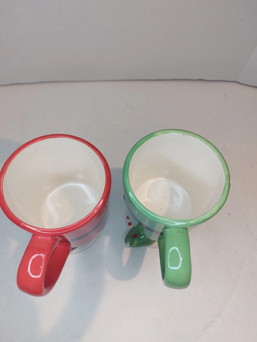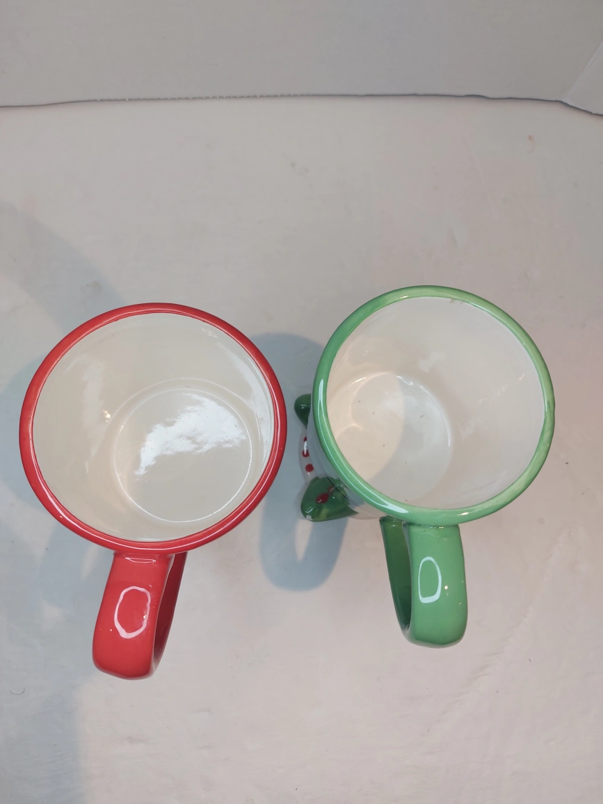 Santa & Elf Ceramic Christmas Mugs - Set of 2 Here's a fun set of two Christmas mugs! One is a Santa mug (red) and the other is an elf mug (green). They're in great condition and ready for your holiday hot chocolate!