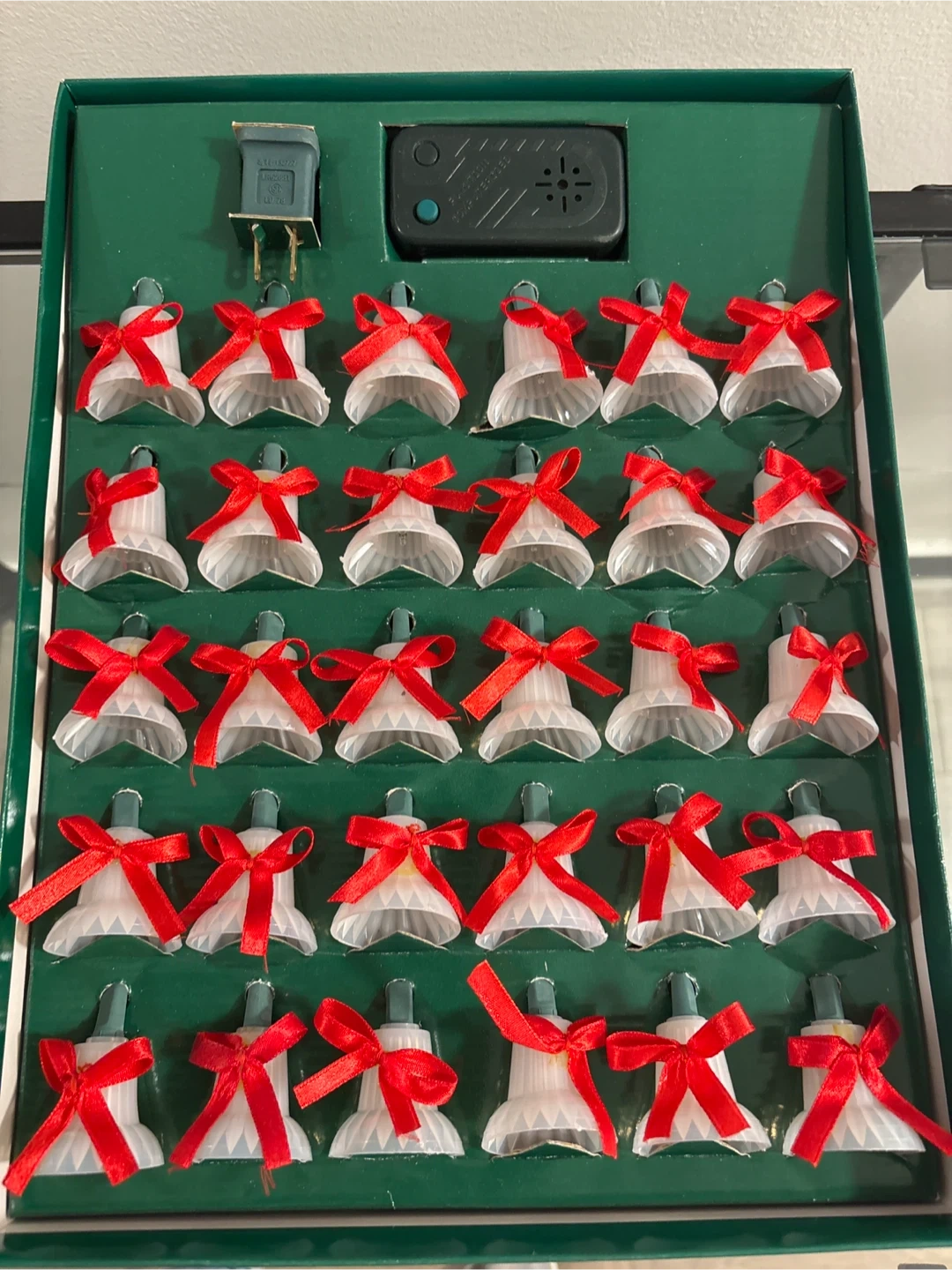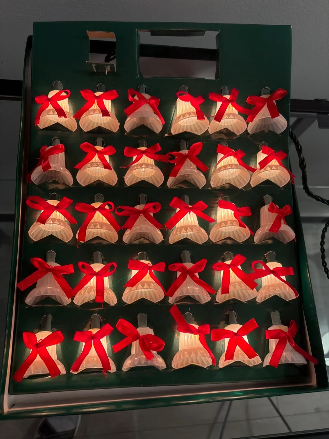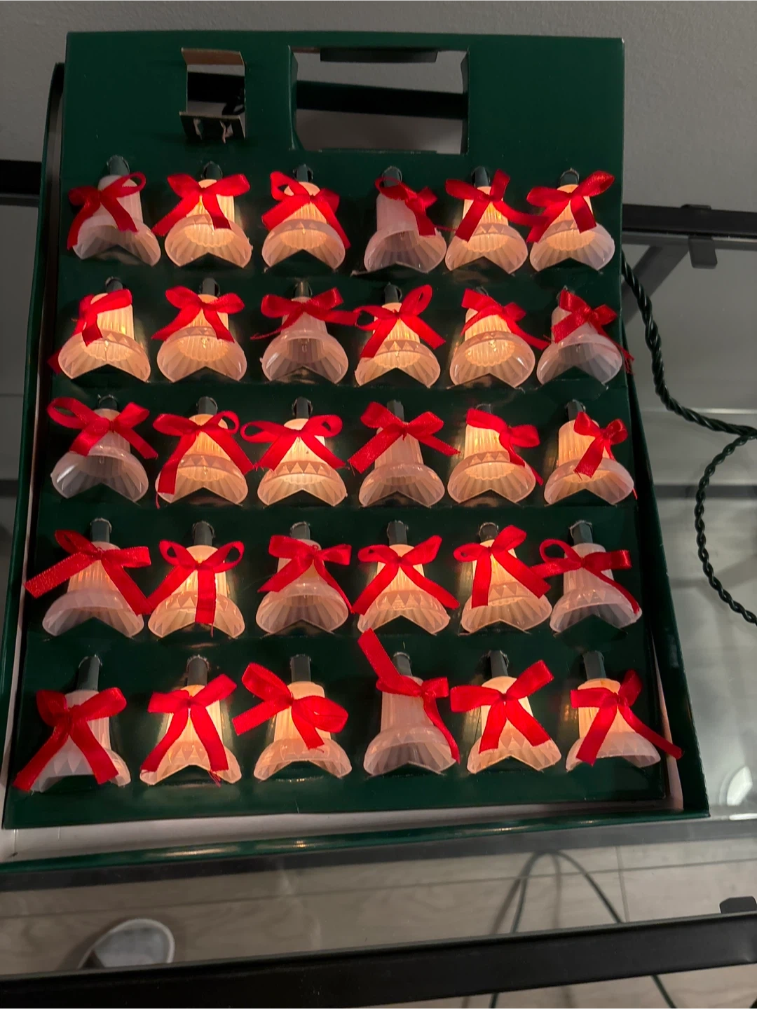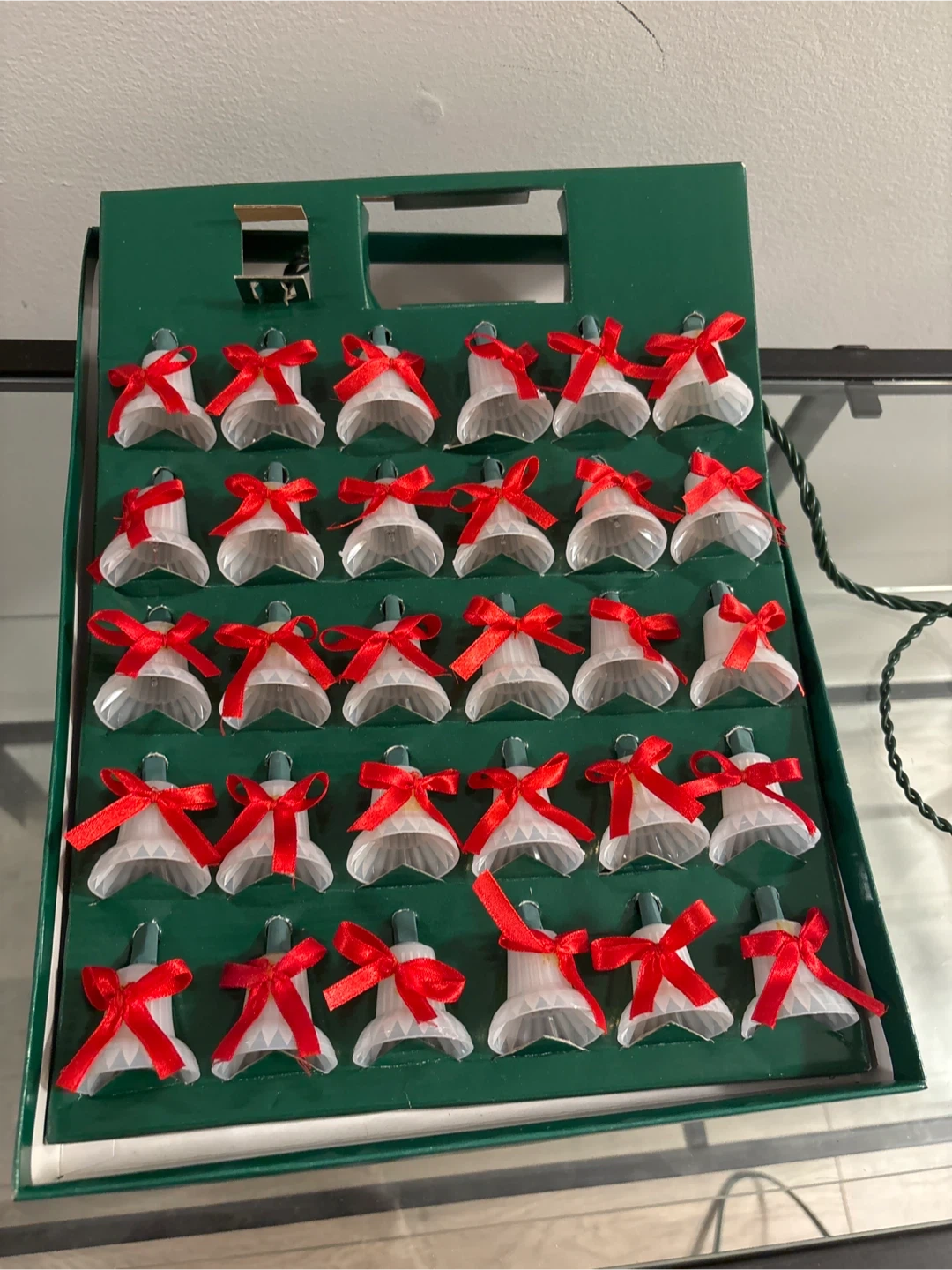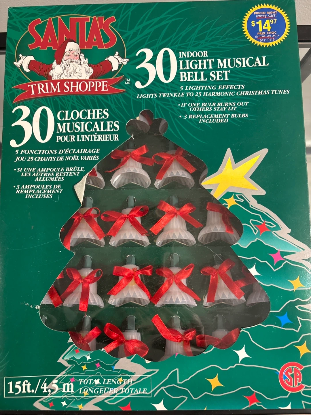 Selling a Santa's Trim Shoppe indoor musical light set! It has 30 bell-shaped lights with red bows. The set plays 25 harmonic Christmas tunes and has 5 lighting effects. Includes 3 replacement bulbs. Total length is 15 ft (4.5 m)