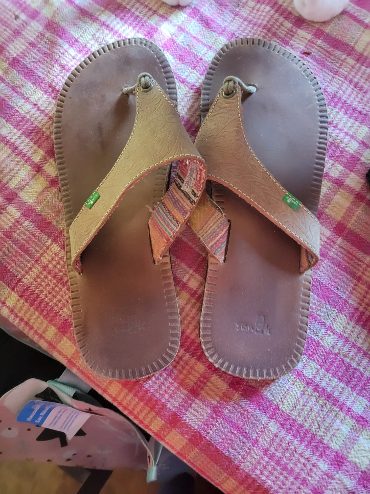 Comfy Sanuk flip flops in good condition! They feature a unique strap design with colourful accents and a soft footbed for all-day wear