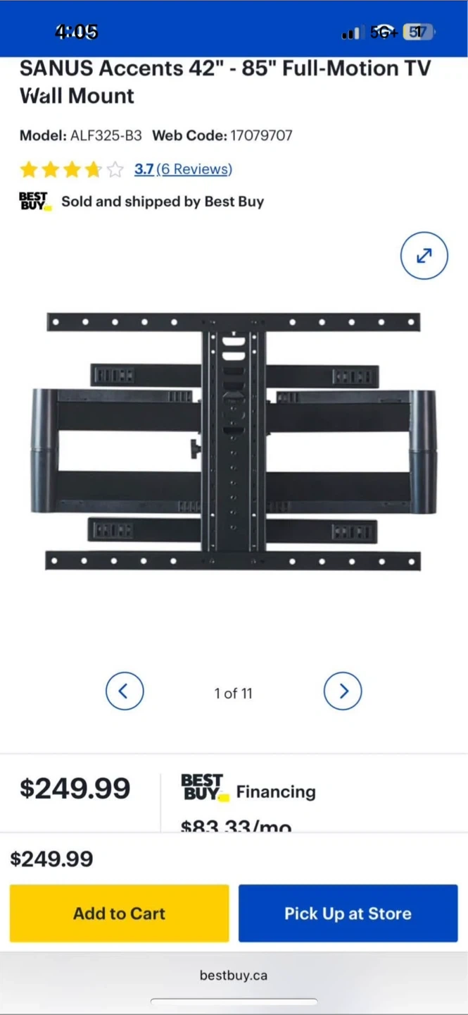 Selling a SANUS Accents full-motion TV wall mount, model ALF325-B3. It's designed for TVs ranging from 42 to 85 inches. Originally bought for $249.99 from Best Buy. The screws are missing
