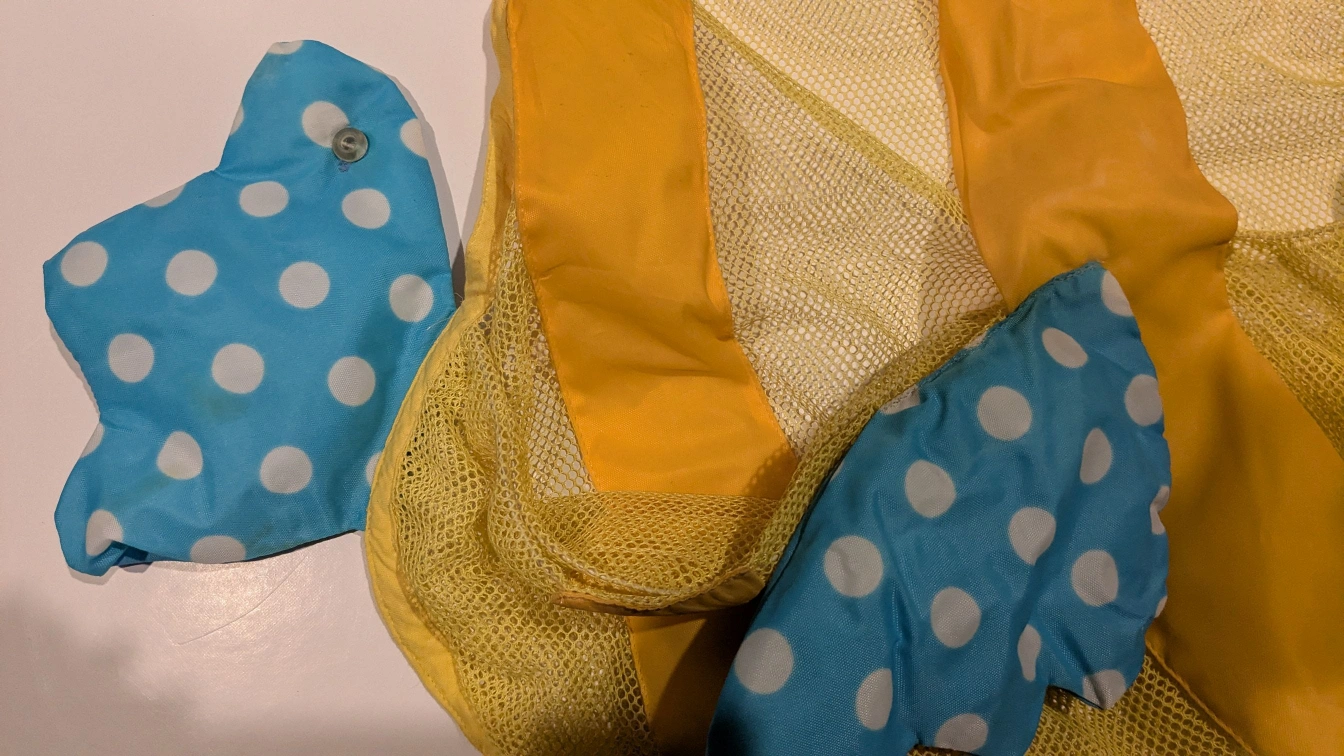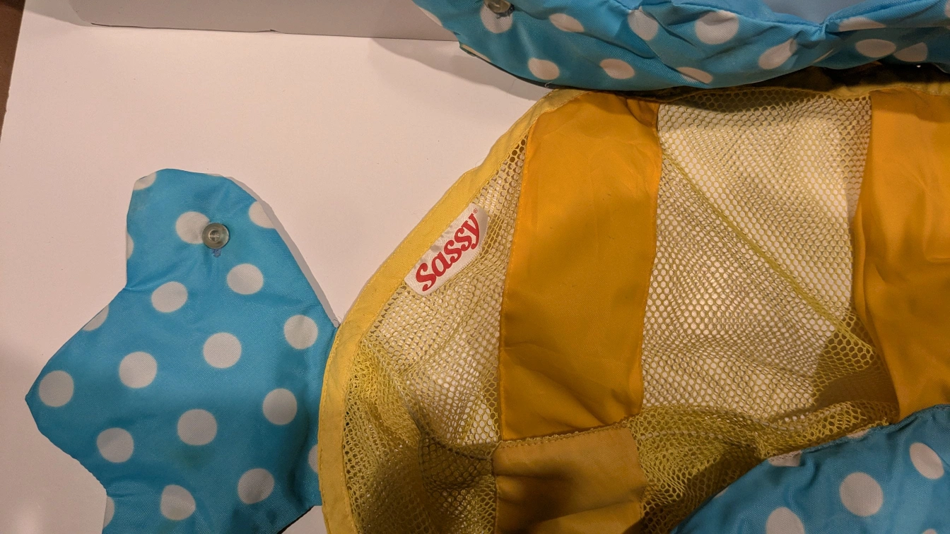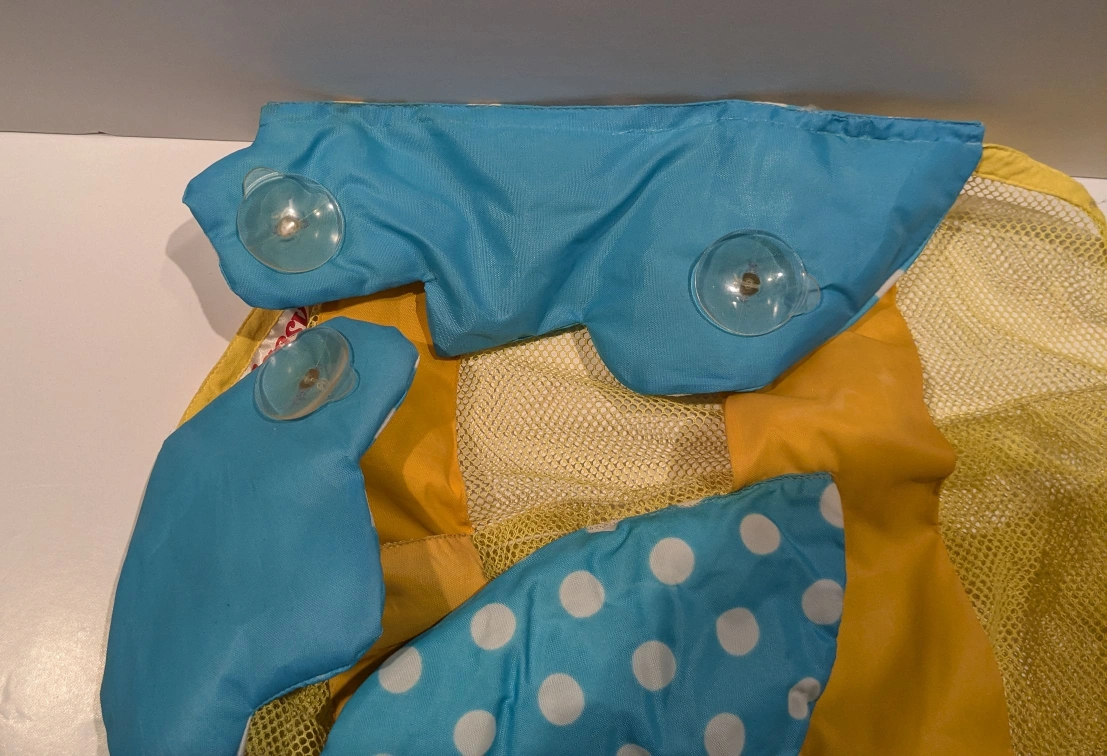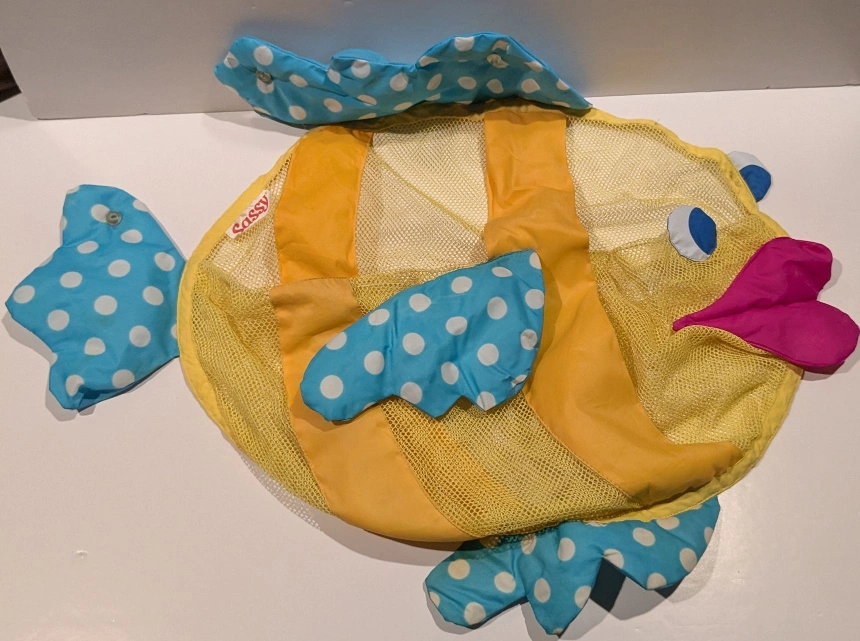 Adorable Sassy brand bath toy. Features a cute fish design. Yellow mesh body with blue polka dot fins and suction cups. Fun for bath time. bathtub toy organizer 27" x 24" suction cups hold this to the side of the bathtub on the wall. This can hold many toys. The mesh design helps the toys drain easily and your bathtub area stay organized. Thank you for looking at our listing. We always welcome questions . From a smoke-free home.