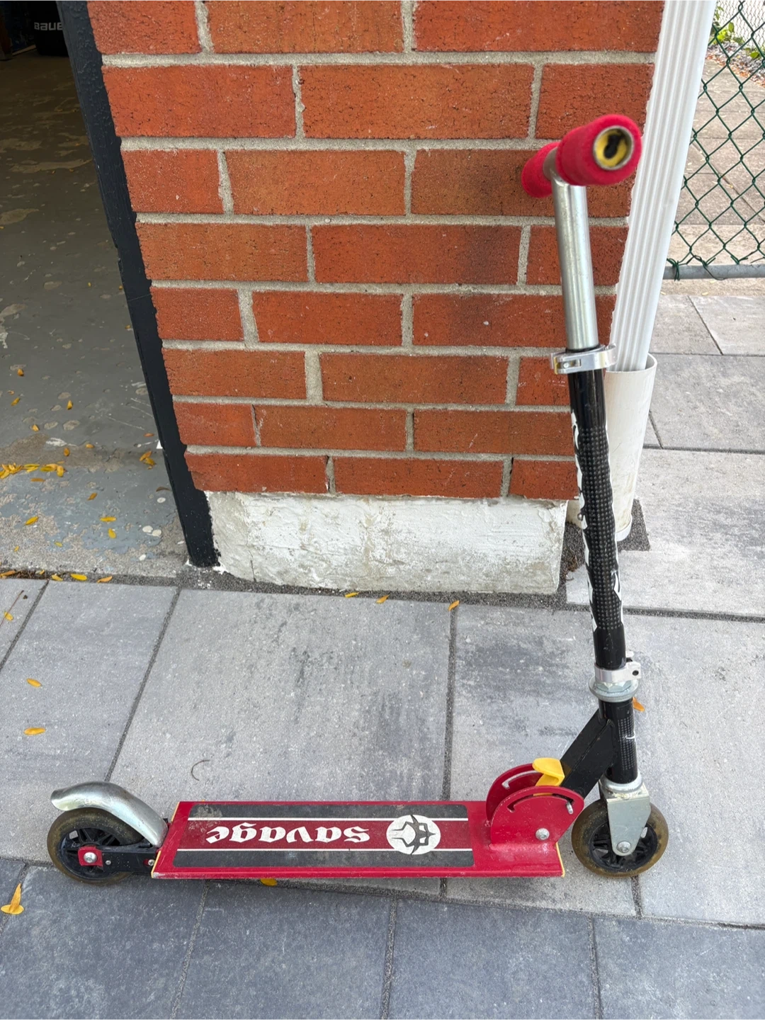 Selling a used Savage scooter in red and black. It has some wear and tear, as you can see in the photos, but it's still lots of fun for kids!