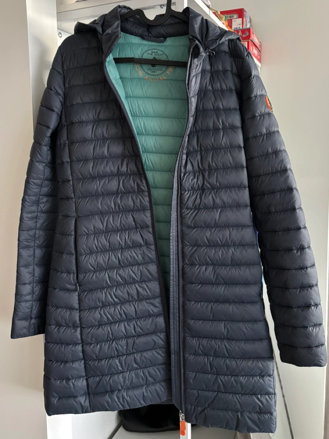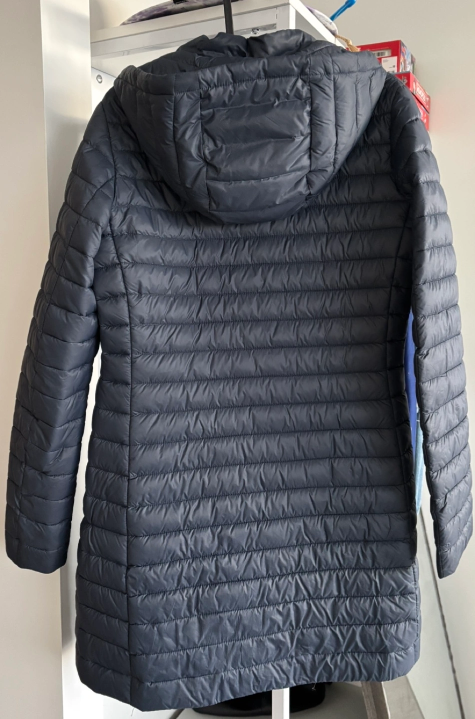 Long, hooded animal-free down jacket with a bidirectional zipper closure and a quilted design. Features include water repellent material, breathability and quick recovery. Available for pickup in Brentwood or meetup elsewhere:)