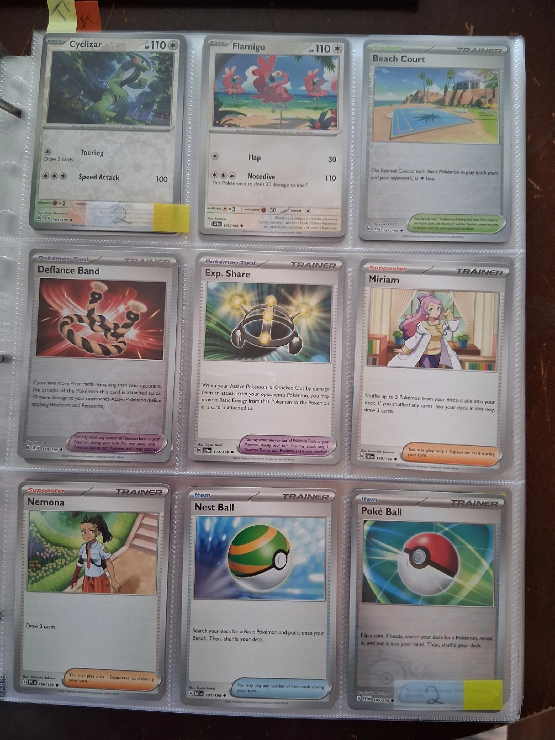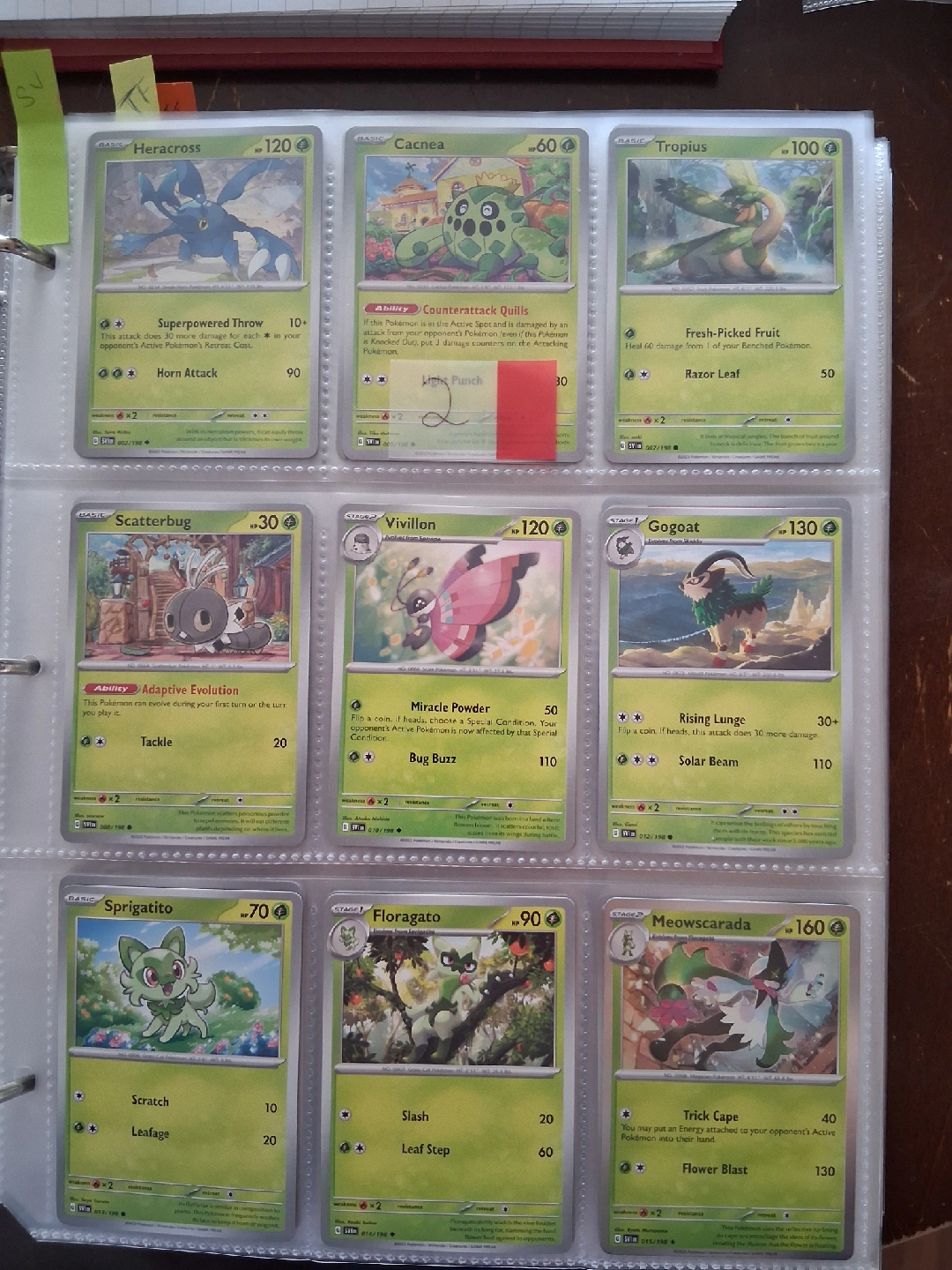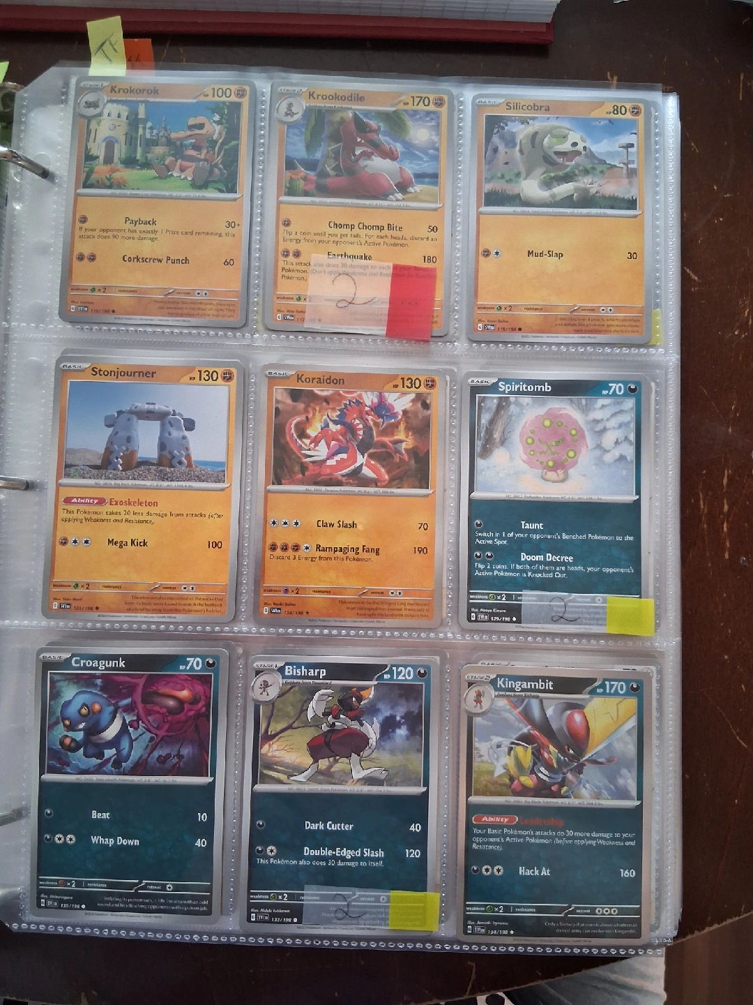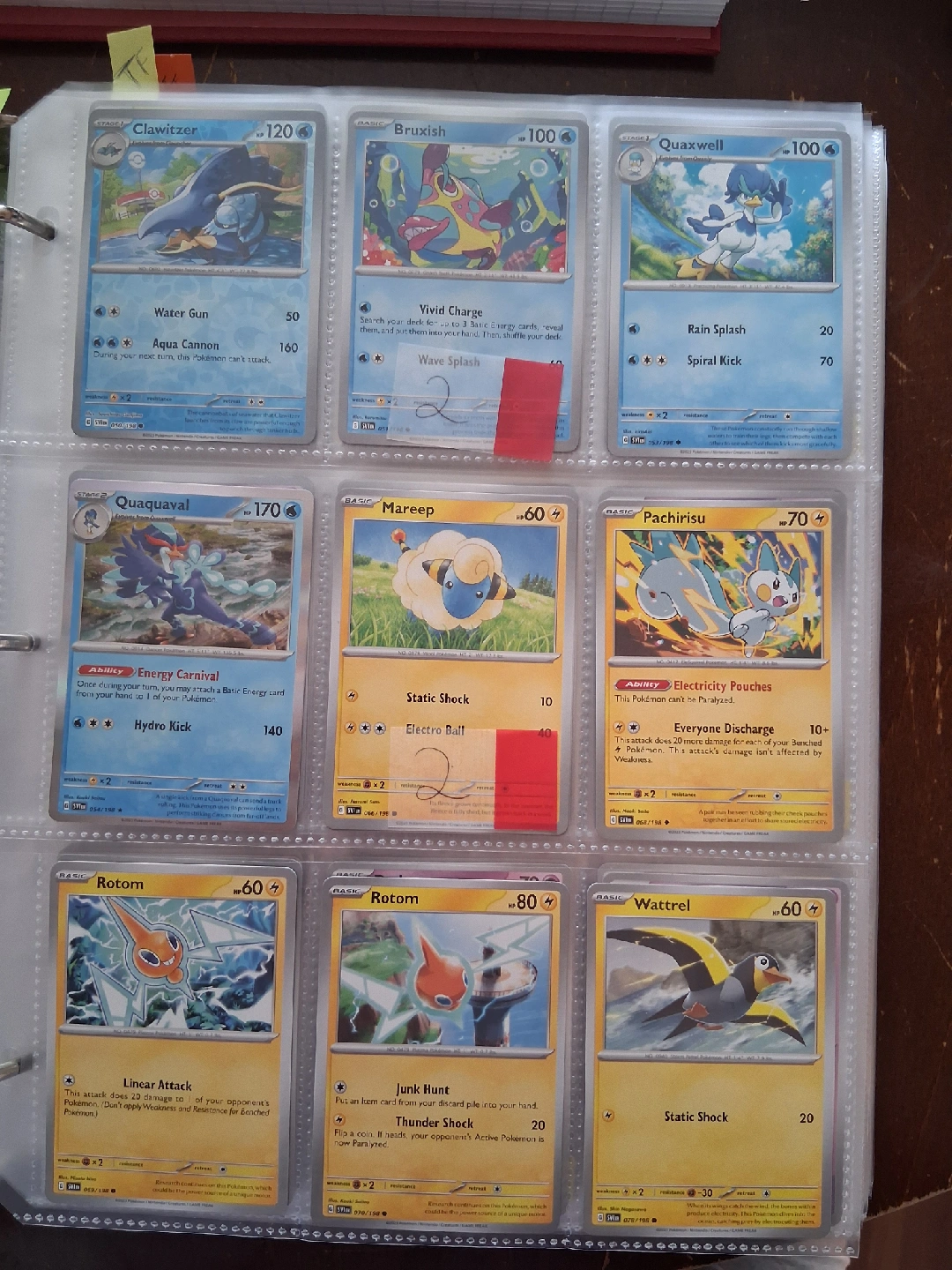 scarlet and violet series. sticky notes indicate 2 of that type of card. all card wee bought at either showcase, Walmart, or gamestop. been in protective sleeves since opened. asking for $1 per card. pick up on Nevin Ave.