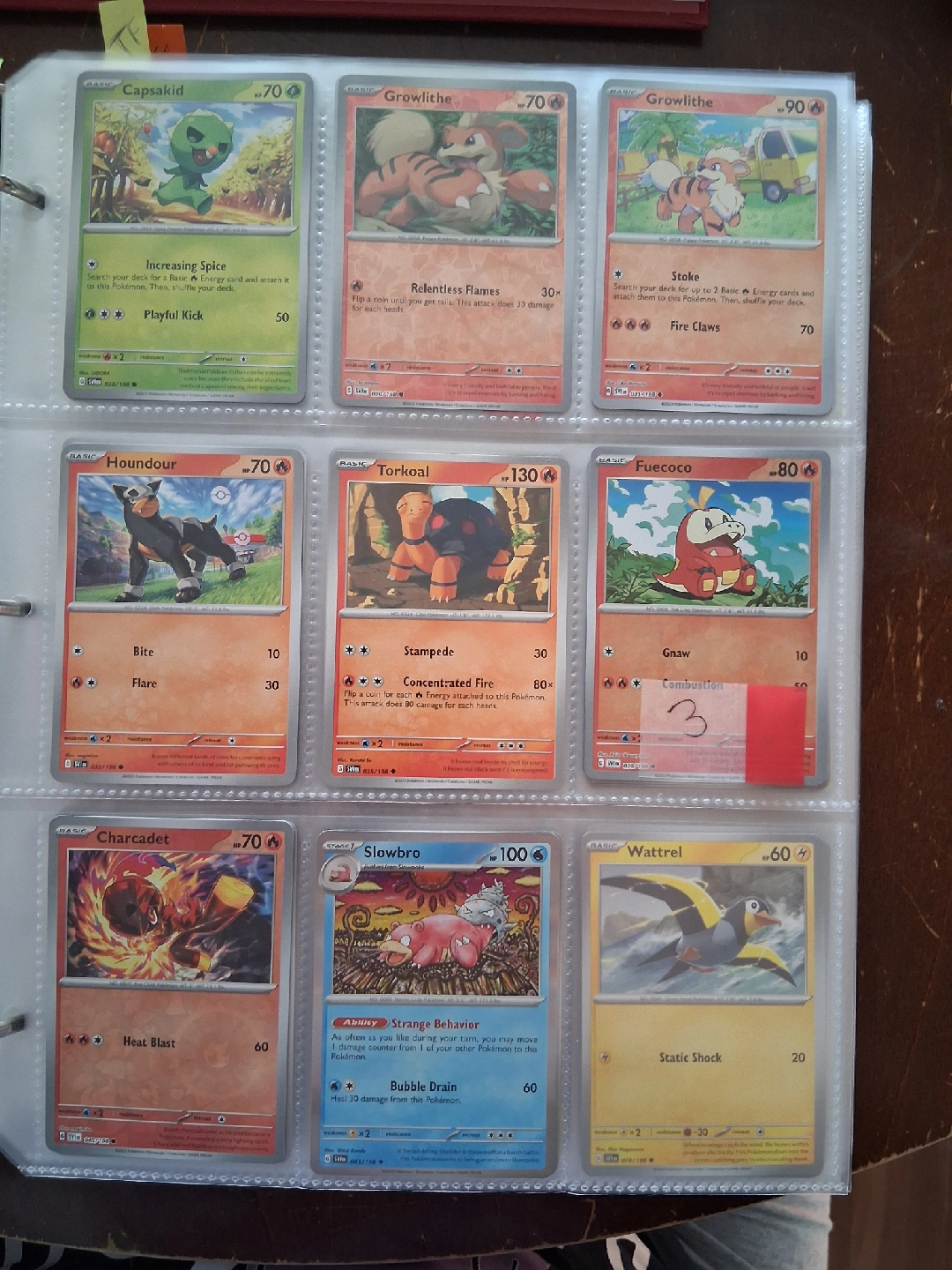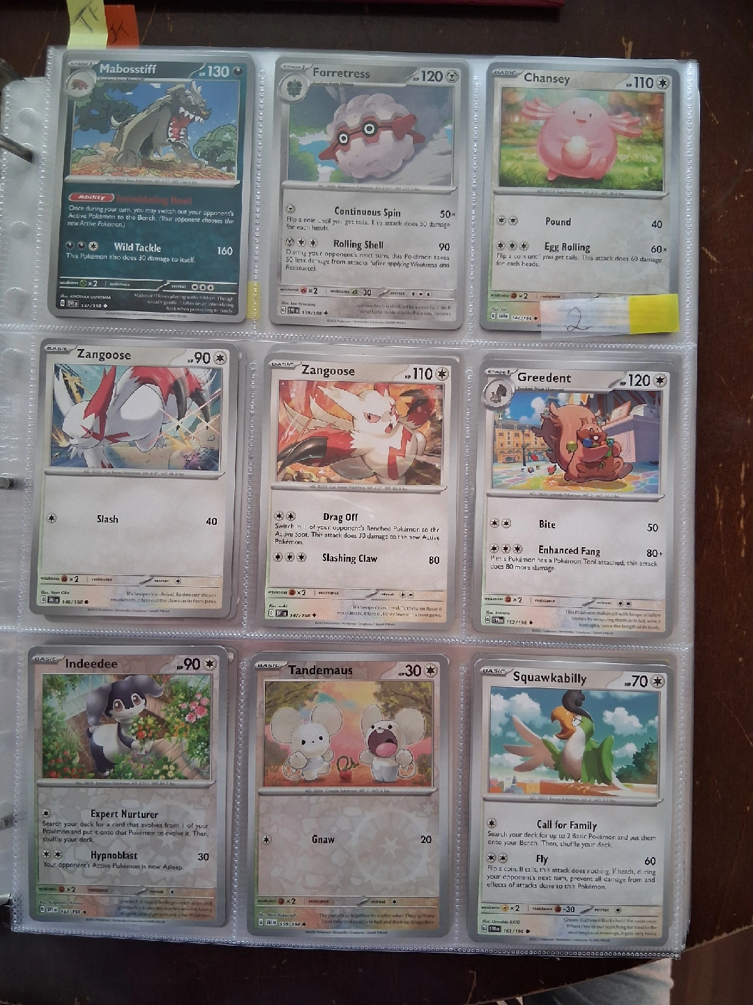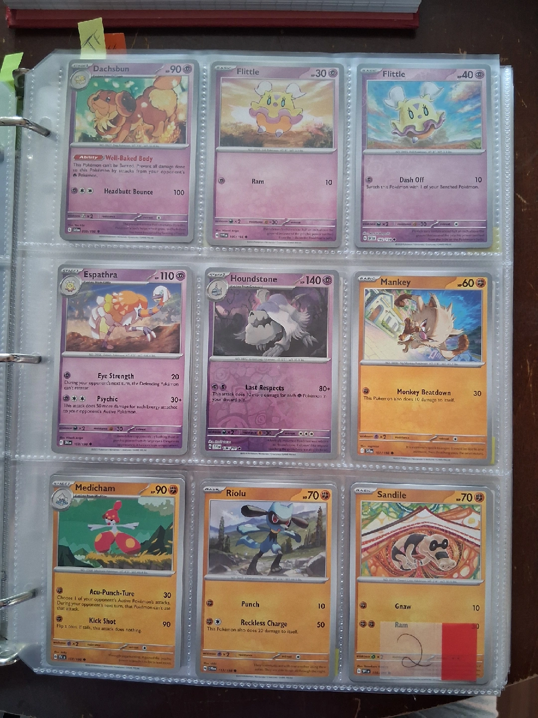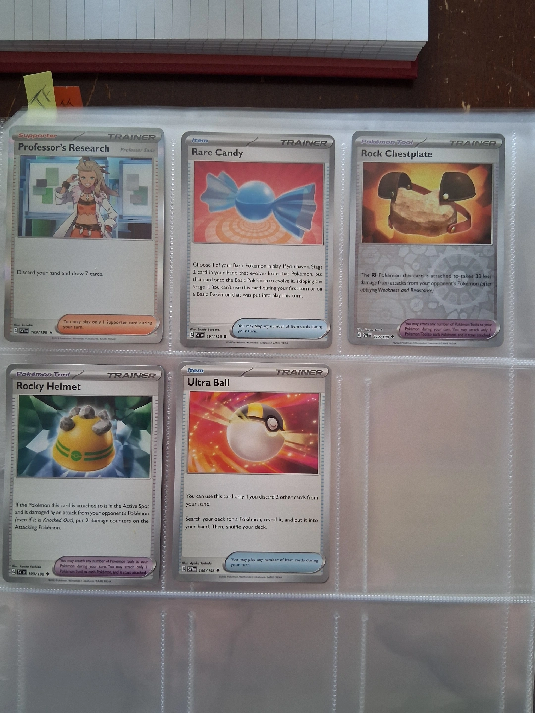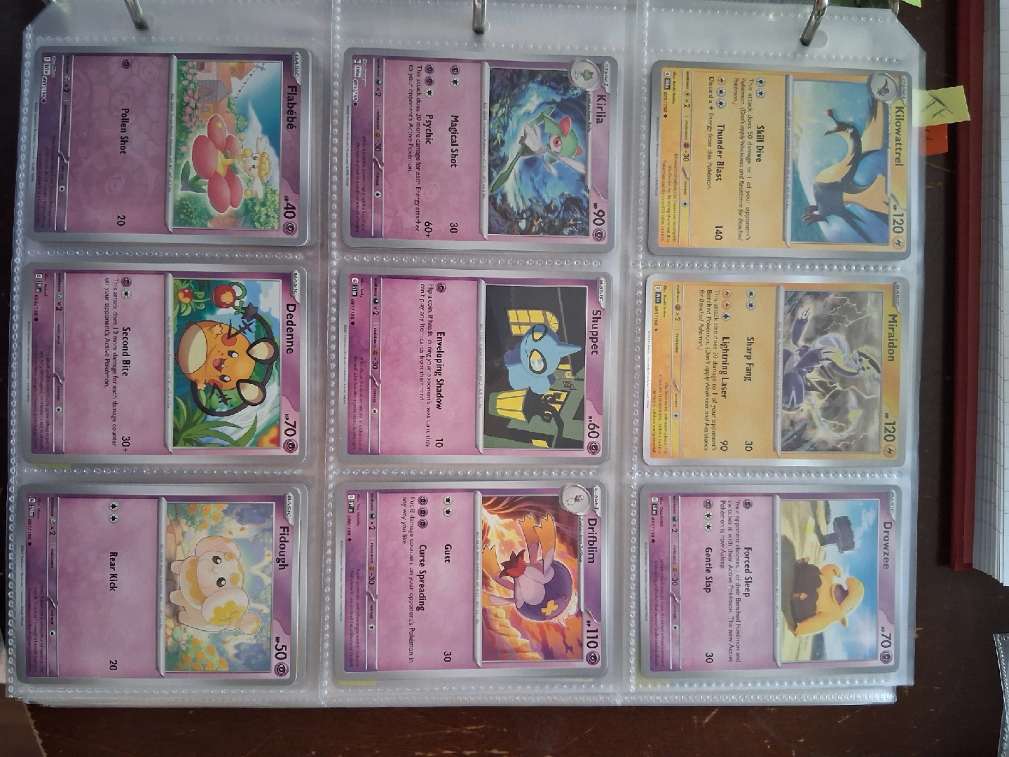 scarlet and violet series. sticky notes indicate 2 of that type of card. all card wee bought at either showcase, Walmart, or gamestop. been in protective sleeves since opened. asking for $1 per card. pick up on Nevin Ave.