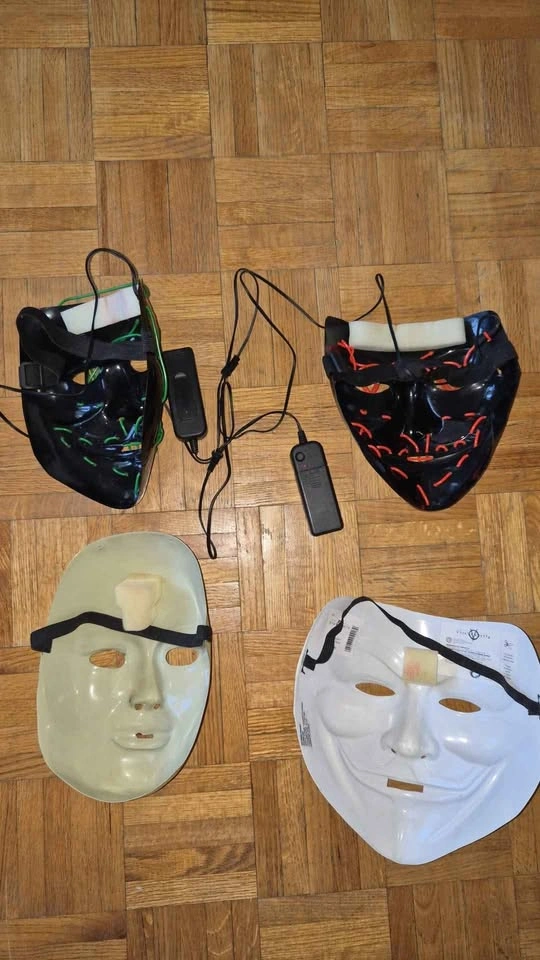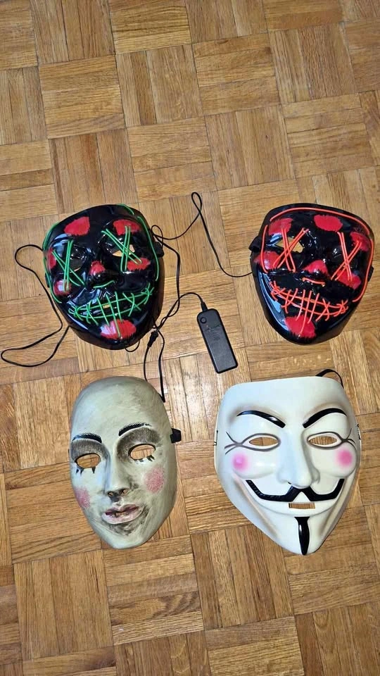 Four halloween masks available $2 each . Masks have been cleaned and sanitized. Ready to go. Must pick up as I do not have a vehicle. Pick up location is 57 union st east in waterloo. (2) Light up Purge: Election Year masks with batteries included. Masks have 3 settings and use 2 AA batteries. $2 each (1) V is for Vendetta face mask $2 (1) Purge: Anarchy face mask $2