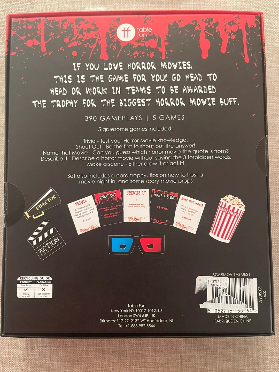Get ready for a spooky movie night with the Scary Movie Night In game set! This game is perfect for horror movie lovers and can be played with 2+ players, ages 16+. It includes 390 gameplays across 5 gruesome games. Test your horror movie knowledge with trivia, shout out the answers, describe movies without using forbidden words, and even act out scenes! The set also includes a card trophy and tips on how to host a scary movie night in, plus some movie props. Unopened still sealed. Cash only