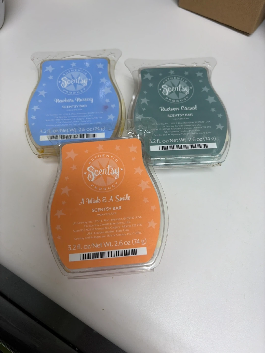 Selling a set of three Scentsy Bar wax melts! Included are the scents Business Casual, Newborn Nursery, and A Wink & A Smile. Each bar is 3.2 fl oz/Net Wt. 2.6 oz (74 g). They're perfect for adding a lovely fragrance to your home I will even throw 2 more that has four left in each , and the set is called. Heartbroken and the others called clean breeze.
