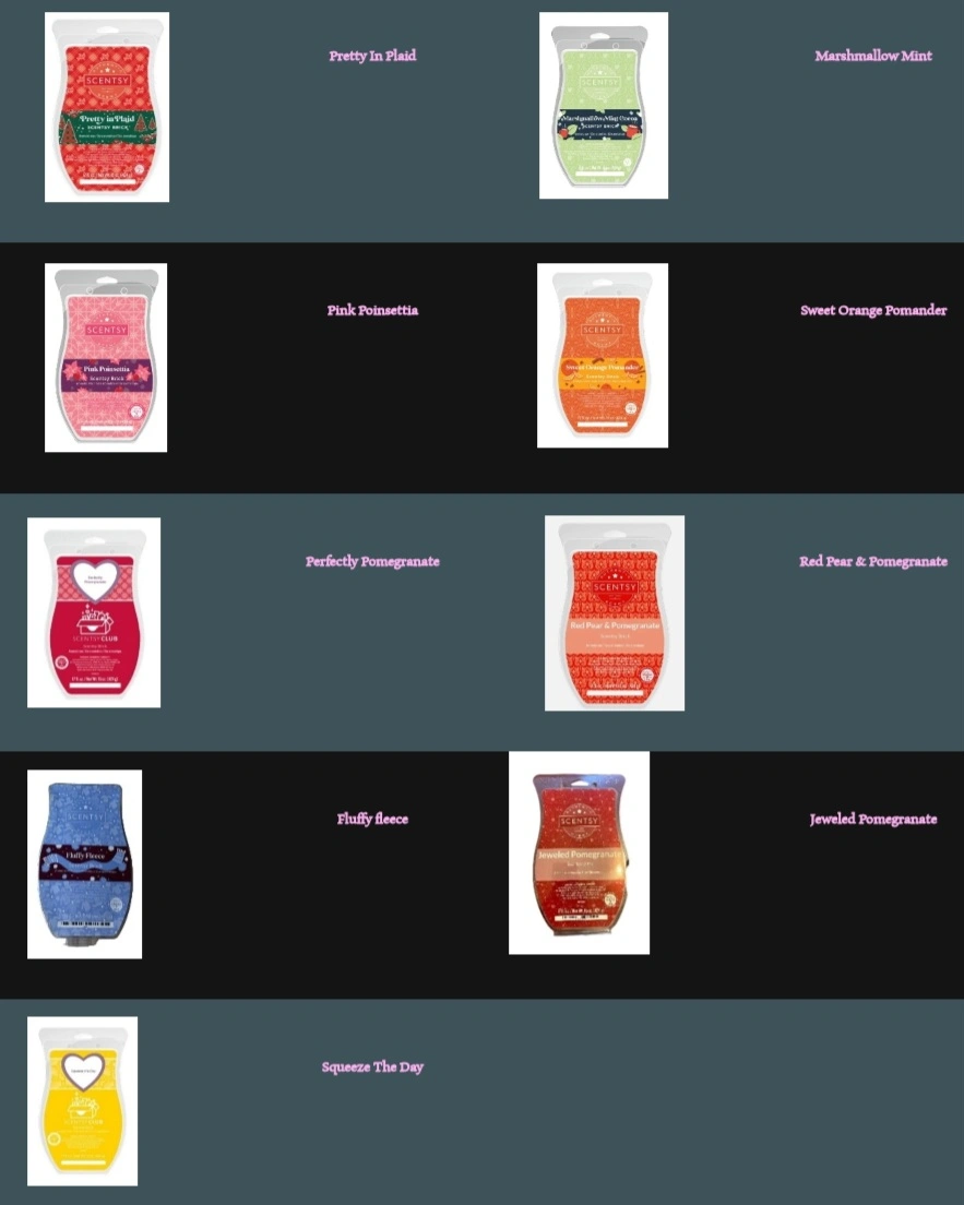 Selling a variety of Scentsy wax melts! Choose from scents like Pretty In Plaid, Marshmallow Mint, Pink Poinsettia, Sweet Orange Pomander, Perfectly Pomegranate, Red Pear & Pomegranate, Fluffy Fleece, Jeweled Pomegranate, and Squeeze The Day! Perfect for adding a lovely fragrance to your home