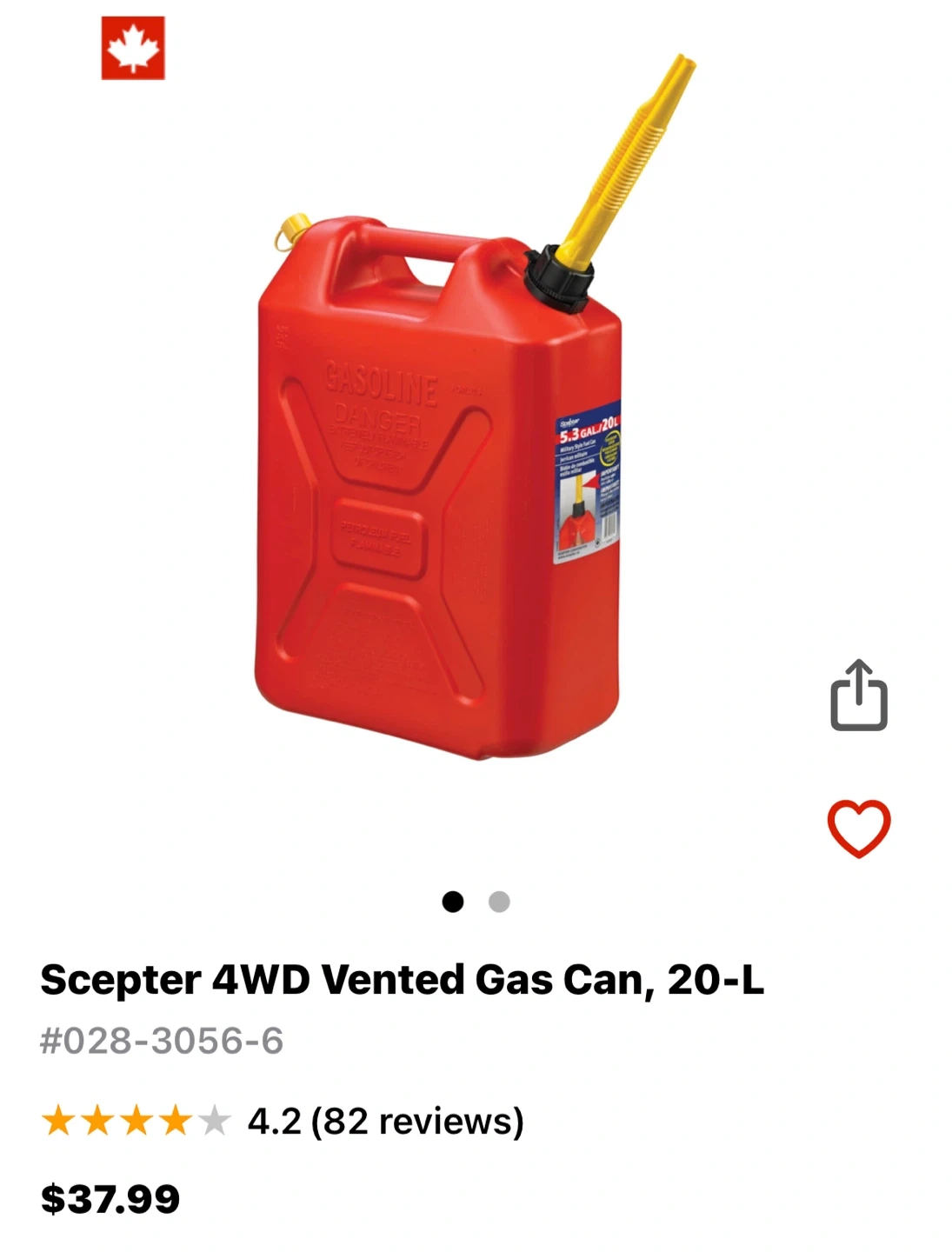 Selling a Scepter 4WD vented gas can. It holds 20 Litres (5.3 Gallons). Originally bought for $37.99