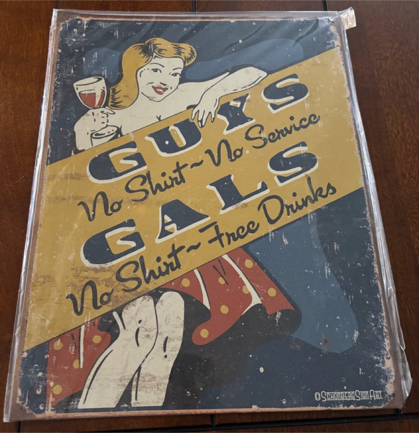 Selling a Schonbergers Sign Art sign that reads "Guys No Shirt - No Service, Gals No Shirt - Free Drinks"! It's in great condition and would be a fun addition to any space