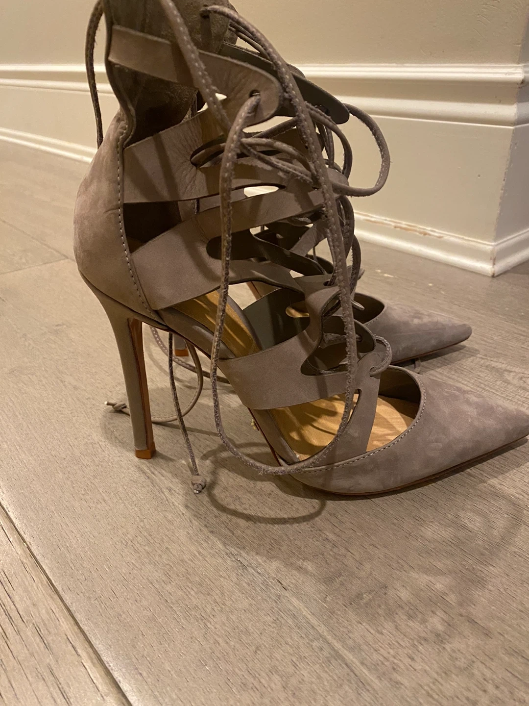 Selling a pair of Schutz heels in a lovely grey suede. They are a size 8B and feature a unique lace-up design. The soles show some signs of wear, but overall they're in good condition and ready for a new home!
