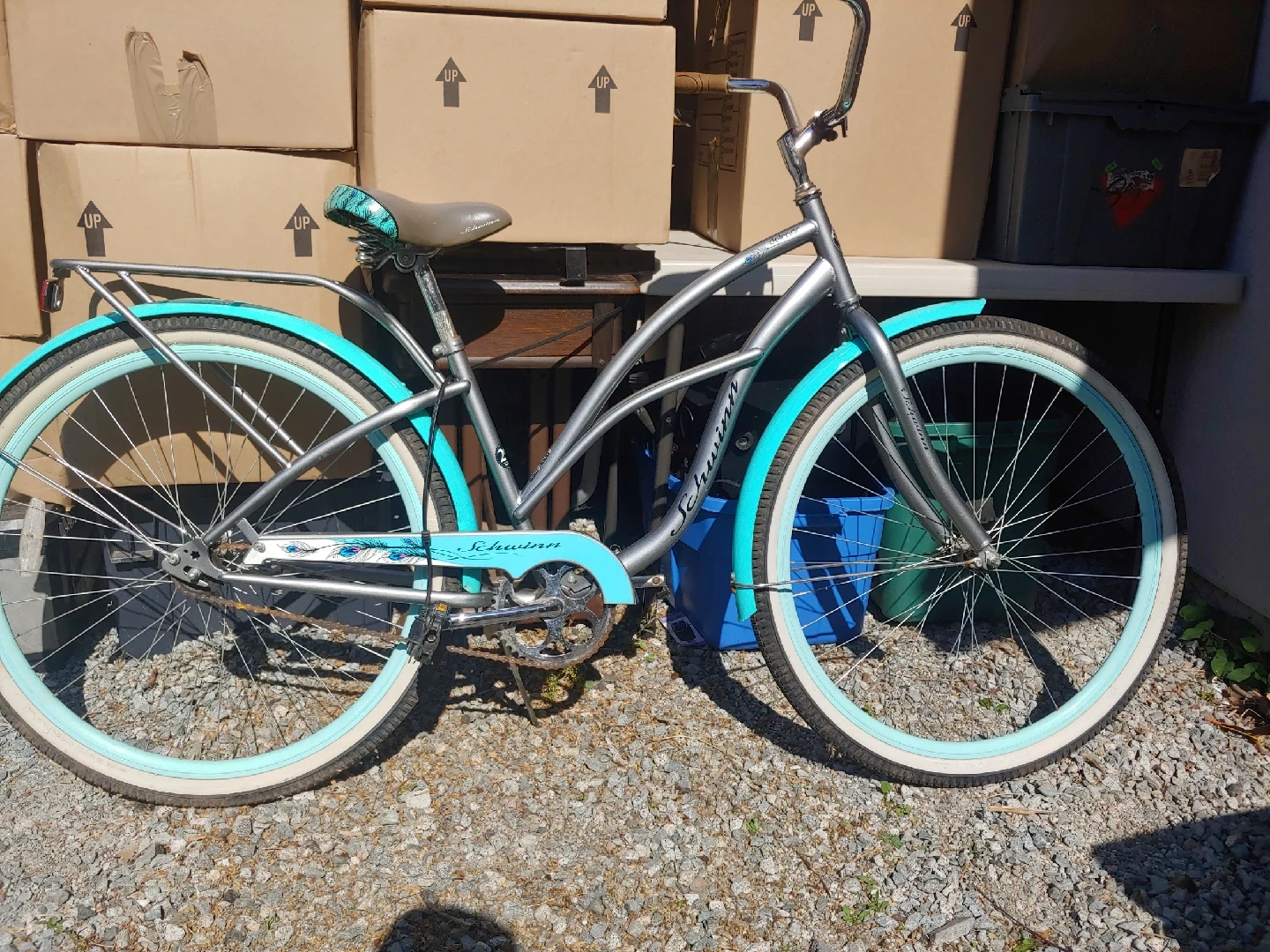 Selling a Schwinn cruiser bike in a lovely turquoise and silver colour scheme. It's perfect for leisurely rides around town or along the boardwalk. The bike features a comfortable seat and classic cruiser styling. The chain may need some maintenance.