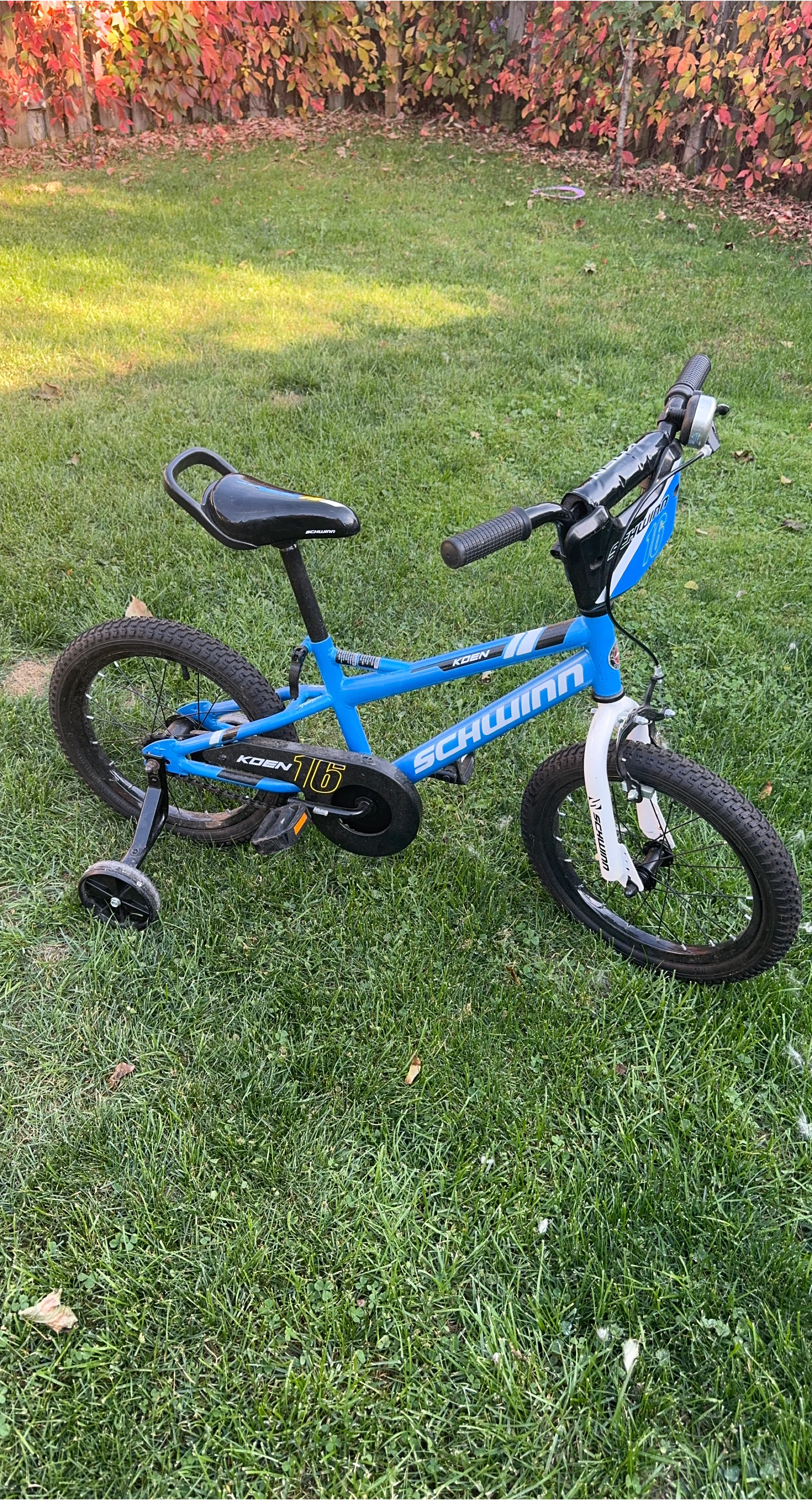 Selling a Schwinn Koen 16-inch kids bike in blue! It's in good condition and perfect for learning to ride. This bike features training wheels, making it ideal for young children. The Schwinn Koen is known for its quality and durability, so it's sure to last through many adventures