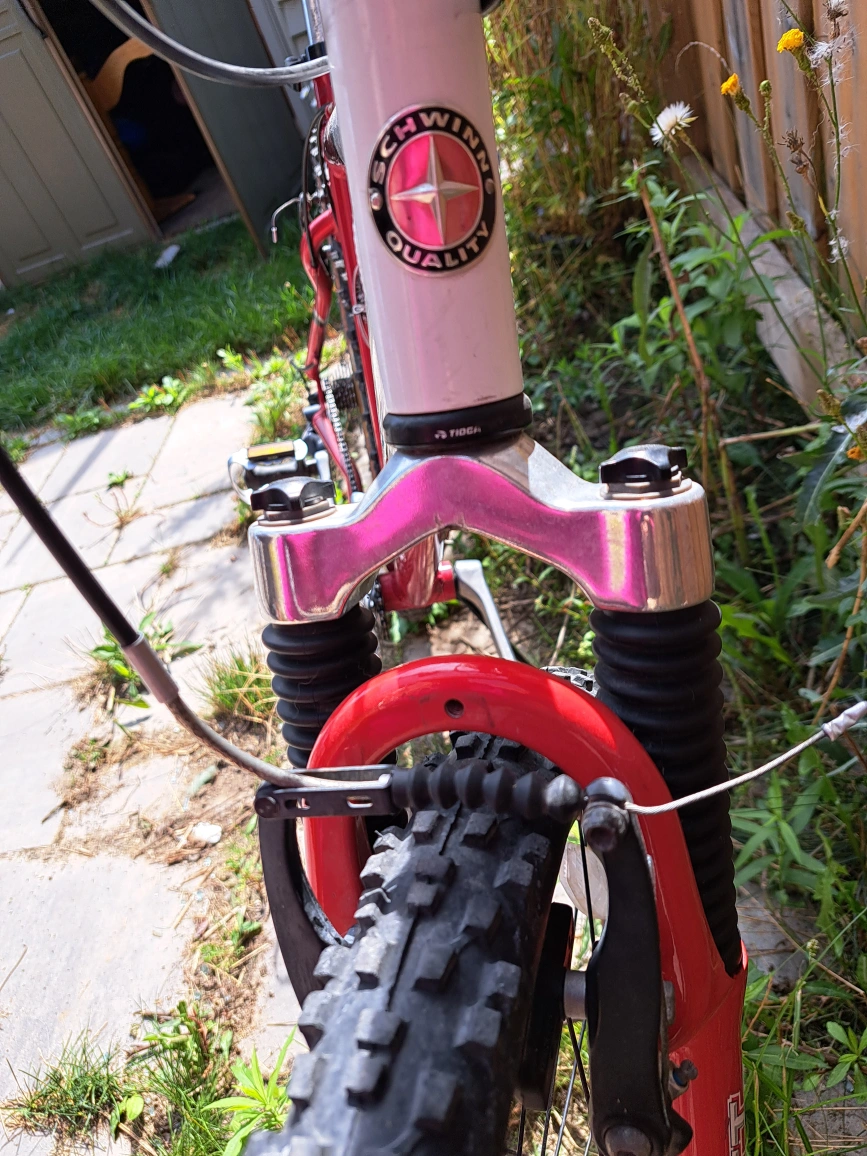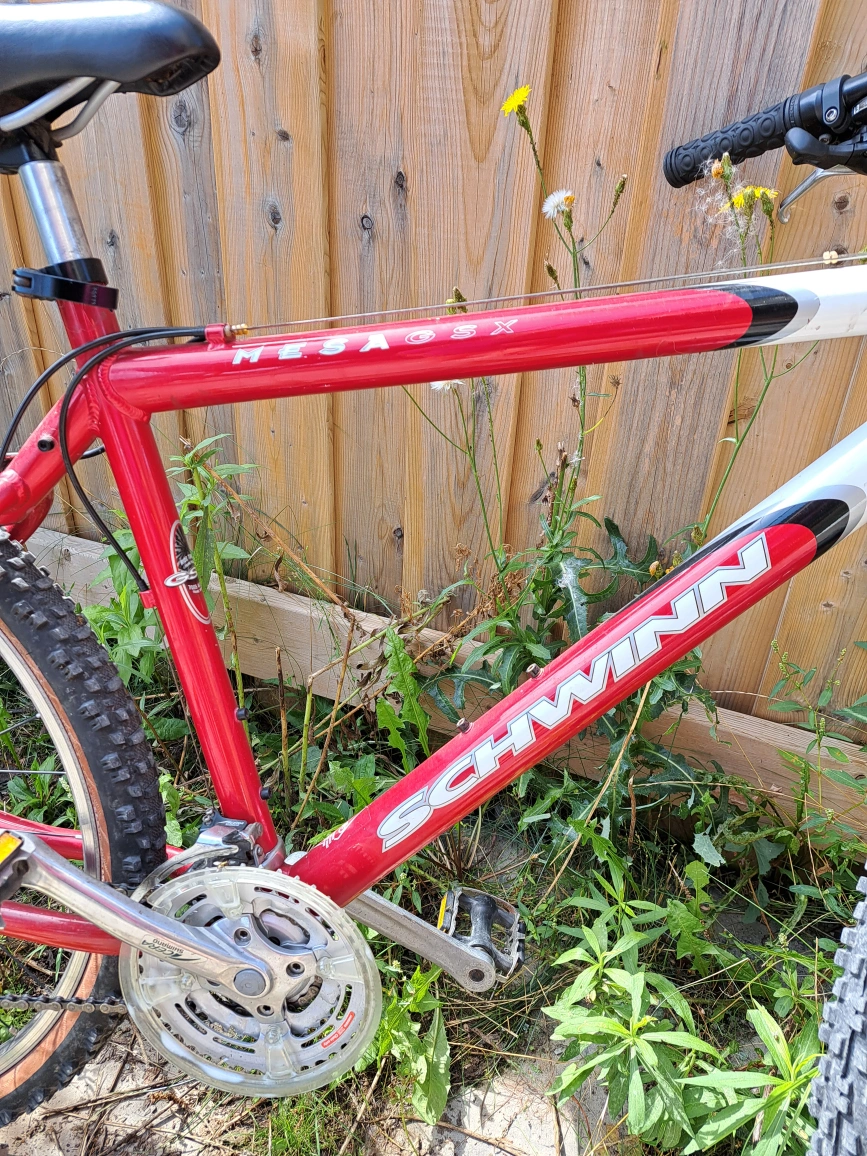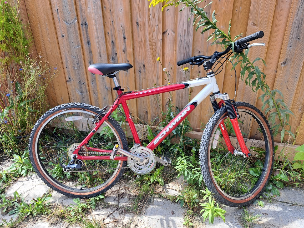 Selling a Schwinn Mega GX mountain bike! It features a red and white frame. A great bike for hitting the trails or just getting around town