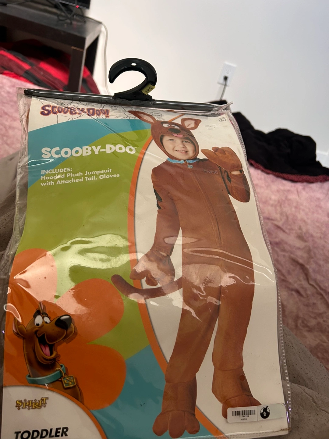 Selling a brand new, in-package Scooby-Doo toddler costume! It includes a hooded plush jumpsuit with an attached tail and gloves. Perfect for dress-up or Halloween! Size 3-4 T