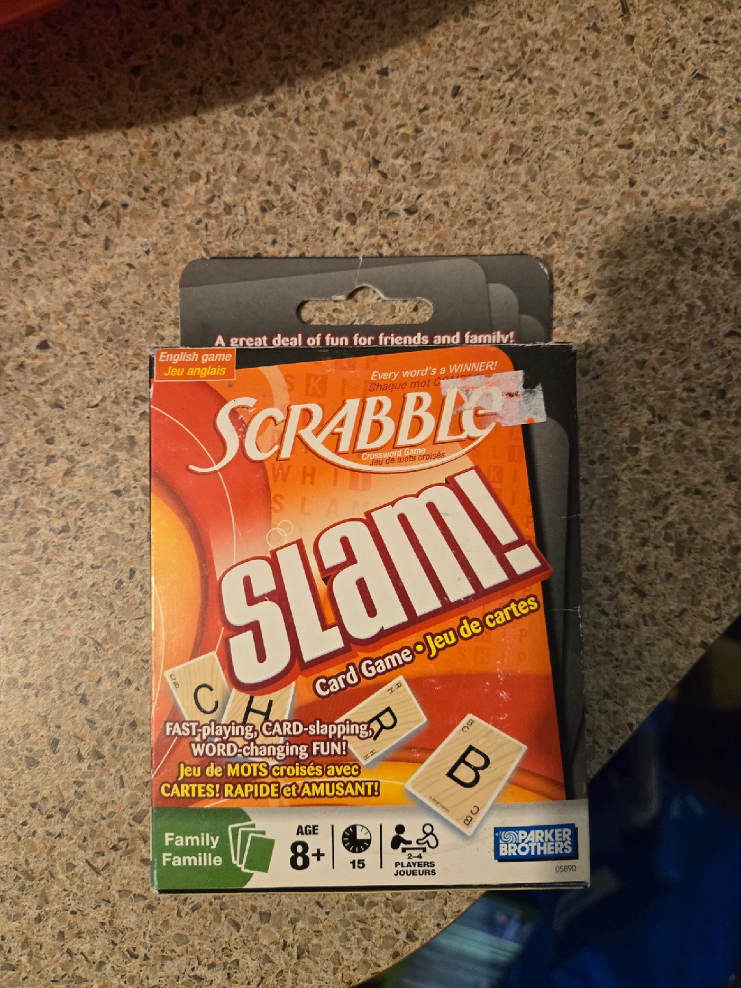Selling a Scrabble Slam! card game. It's a fast-playing, card-slapping, word-changing fun game for the whole family! Recommended for ages 8+, and can be played with 2-4 players.