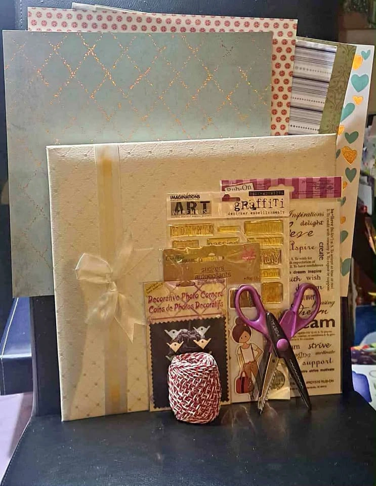 The scrapbook has never been used. It has a soft white fabric with a bow, perfect for wedding photos. I added a few pieces of scrapbook paper, corners, stickers, dry transfer and a pair of scissors. I have used the scissors a couple times but other than that it's all new stuff I was just holding onto it for a project someday.