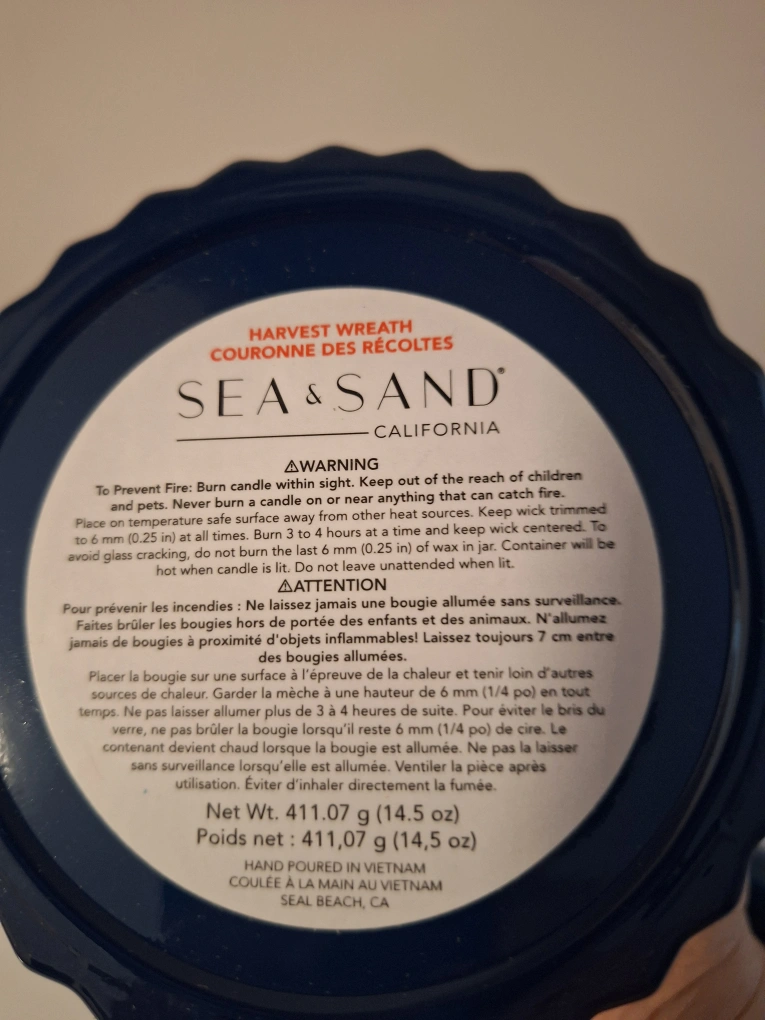 Selling a Sea & Sand California Harvest Wreath candle. It's in great shape and ready to bring a cozy vibe to your space! The candle is hand-poured in Vietnam and has a net weight of 411.07 g (14.5 oz).
