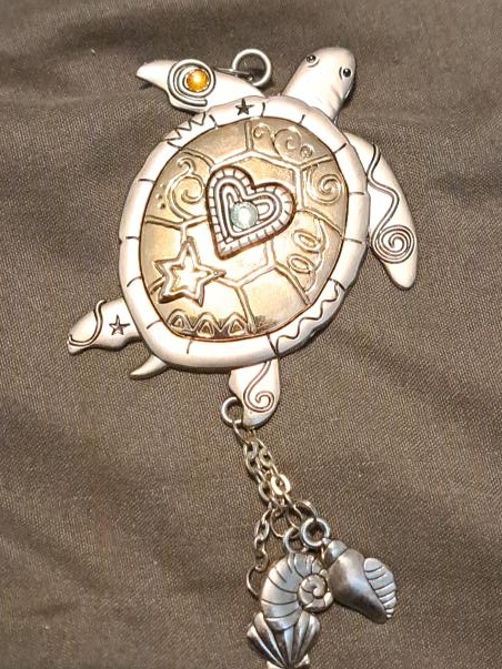 A charming, detailed sea turtle pendant. It has a decorative shell design, complete with heart and star accents. Below are small ocean themed charms. Such a pendant is sure to bring some calming coastal vibes to your day.