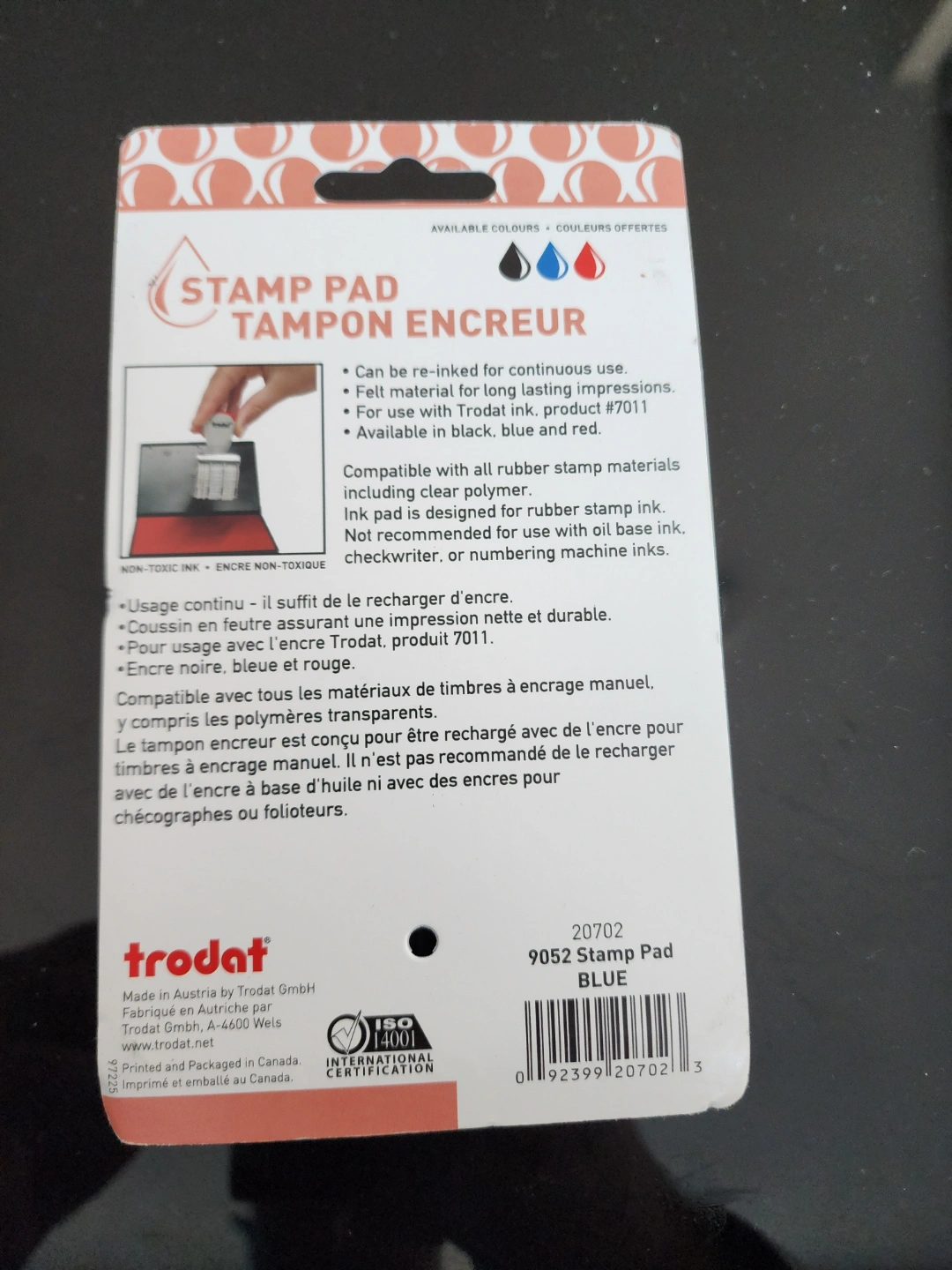 Sealed pack New Trodat 20702 blue stamp pad. Re-inkable. Compatible with rubber stamp materials. For use with black, blue and red ink. Made in Austria.